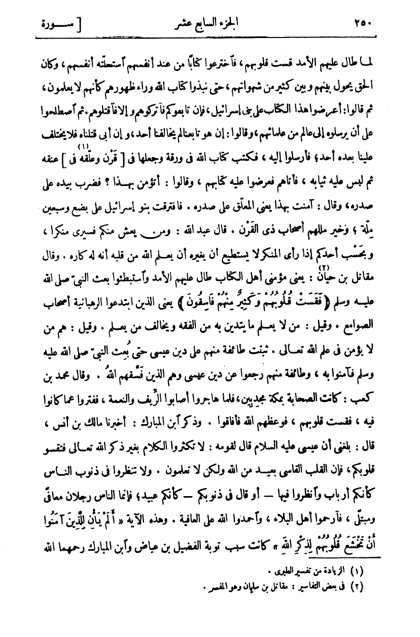 لَمَّا طَالَ عَلَيْهِمُ الْأَمَدُ قَسَتْ قُلُوبُهُمْ، فَاخْتَرَعُوا كِتَابًا مِنْ عِنْدِ أَنْفُسِهِمُ اسْتَحَلَّتْهُ أَنْفُسُهُمْ، وَكَانَ الْحَقُّ يَحُولُ بَيْنَهُمْ وَبَيْنَ كَثِيرٍ مِنْ شَهَوَاتِهِمْ، حَتَّى نَبَذُوا كِتَابَ اللَّهِ وَرَاءَ ظُهُورِهِمْ كَأَنَّهُمْ لَا يَعْلَمُونَ، ثُمَّ قَالُوا: أَعْرِضُوا هَذَا الْكِتَابَ عَلَى بَنِي إِسْرَائِيلَ، فَإِنْ تَابَعُوكُمْ فَاتْرُكُوهُمْ وَإِلَّا فَاقْتُلُوهُمْ. ثُمَّ اصْطَلَحُوا عَلَى أَنْ يُرْسِلُوهُ إِلَى عَالِمٍ مِنْ عُلَمَائِهِمْ، وَقَالُوا: إِنْ هُوَ تَابَعَنَا لَمْ يُخَالِفْنَا أَحَدٌ، وَإِنْ أَبَى قَتَلْنَاهُ فَلَا يَخْتَلِفُ عَلَيْنَا بَعْدَهُ أَحَدٌ، فَأَرْسَلُوا إِلَيْهِ، فَكَتَبَ كِتَابَ اللَّهِ فِي وَرَقَةٍ وَجَعَلَهَا فِي [قَرْنٍ وَعَلَّقَهُ «١» فِي] عُنُقِهِ ثُمَّ لَبِسَ عَلَيْهِ ثِيَابَهُ، فَأَتَاهُمْ فَعَرَضُوا عَلَيْهِ كِتَابَهُمْ، وَقَالُوا: أَتُؤْمِنُ بِهَذَا؟ فَضَرَبَ بِيَدِهِ عَلَى صَدْرِهِ، وَقَالَ: آمَنْتُ بِهَذَا يَعْنِي الْمُعَلَّقَ عَلَى صَدْرِهِ. فَافْتَرَقَتْ بَنُو إِسْرَائِيلَ عَلَى بِضْعٍ وَسَبْعِينَ مِلَّةً، وَخَيْرُ مِلَلِهِمْ أَصْحَابُ ذِي الْقَرْنِ. قَالَ عَبْدُ اللَّهِ: وَمَنْ يَعِشْ مِنْكُمْ فَسَيَرَى مُنْكَرًا، وَبِحَسْبِ أَحَدِكُمْ إِذَا رَأَى الْمُنْكَرَ لَا يَسْتَطِيعُ أَنْ يُغَيِّرَهُ أَنْ يَعْلَمَ اللَّهُ مِنْ قَلْبِهِ أَنَّهُ لَهُ كَارِهٌ. وَقَالَ مُقَاتِلُ بْنُ حَيَّانَ «٢»: يَعْنِي مُؤْمِنِي أَهْلِ الْكِتَابِ طَالَ عَلَيْهِمُ الْأَمَدُ وَاسْتَبْطَئُوا بَعْثَ النَّبِيِّ صَلَّى اللَّهُ عَلَيْهِ وَسَلَّمَ (فَقَسَتْ قُلُوبُهُمْ وَكَثِيرٌ مِنْهُمْ فاسِقُونَ) يَعْنِي الَّذِينَ ابْتَدَعُوا الرَّهْبَانِيَّةَ أَصْحَابَ الصَّوَامِعِ. وَقِيلَ: مَنْ لَا يَعْلَمُ مَا يَتَدَيَّنُ بِهِ مِنَ الْفِقْهِ وَيُخَالِفُ مَنْ يَعْلَمُ. وَقِيلَ: هُمْ مَنْ لَا يُؤْمِنُ فِي عِلْمِ اللَّهِ تَعَالَى. ثَبَتَتْ طَائِفَةٌ مِنْهُمْ عَلَى دِينِ عِيسَى حَتَّى بُعِثَ النَّبِيُّ صَلَّى اللَّهُ عَلَيْهِ وَسَلَّمَ فَآمَنُوا بِهِ، وَطَائِفَةٌ مِنْهُمْ رَجَعُوا عَنْ دِينِ عِيسَى وَهُمُ الَّذِينَ فَسَّقَهُمُ اللَّهُ. وَقَالَ مُحَمَّدُ بْنُ كَعْبٍ: كَانَتِ الصَّحَابَةُ بِمَكَّةَ مُجْدِبِينَ، فَلَمَّا هَاجَرُوا أَصَابُوا الرِّيفَ وَالنِّعْمَةَ، فَفَتَرُوا عَمَّا كَانُوا فِيهِ، فَقَسَتْ قُلُوبُهُمْ، فَوَعَظَهُمُ اللَّهُ فَأَفَاقُوا. وَذَكَرَ ابْنُ الْمُبَارَكِ: أَخْبَرَنَا مَالِكُ بْنُ أَنَسٍ، قَالَ: بَلَغَنِي أَنَّ عِيسَى عَلَيْهِ السَّلَامُ قَالَ لِقَوْمِهِ: لَا تُكْثِرُوا الْكَلَامَ بِغَيْرِ ذِكْرِ اللَّهِ تَعَالَى فَتَقْسُو قُلُوبُكُمْ، فَإِنَّ الْقَلْبَ الْقَاسِيَ بَعِيدٌ مِنَ اللَّهِ وَلَكِنْ لَا تَعْلَمُونَ. وَلَا تَنْظُرُوا فِي ذُنُوبِ النَّاسِ كَأَنَّكُمْ أَرْبَابٌ وَانْظُرُوا فِيهَا- أَوْ قَالَ فِي ذُنُوبِكُمْ- كَأَنَّكُمْ عَبِيدٌ، فَإِنَّمَا النَّاسُ رَجُلَانِ مُعَافًى وَمُبْتَلًى، فَارْحَمُوا أَهْلَ الْبَلَاءِ، وَاحْمَدُوا اللَّهَ عَلَى الْعَافِيَةِ. وَهَذِهِ الْآيَةُ (أَلَمْ يَأْنِ لِلَّذِينَ آمَنُوا أَنْ تَخْشَعَ قُلُوبُهُمْ لِذِكْرِ اللَّهِ) كَانَتْ سَبَبُ تَوْبَةِ الْفُضَيْلِ بْنِ عِيَاضٍ وَابْنِ الْمُبَارَكِ رحمهما الله