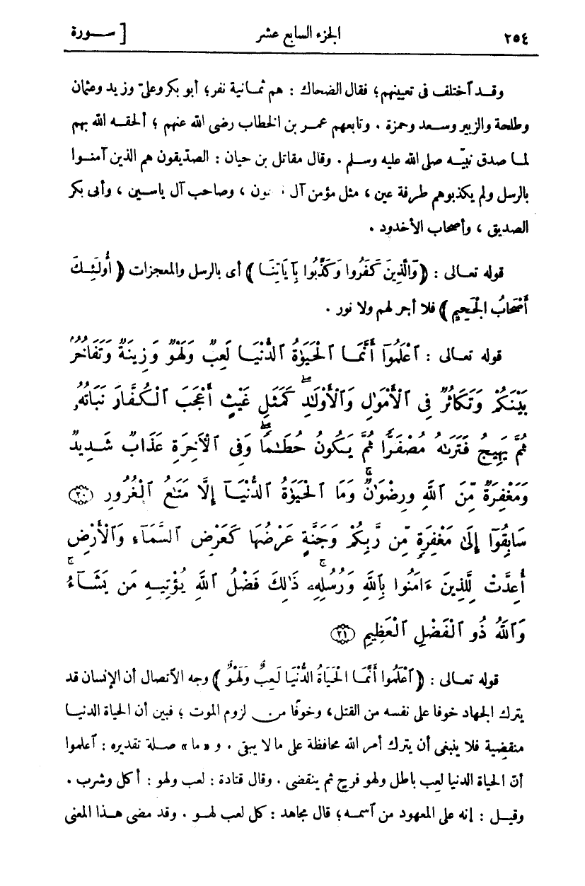 اعْلَمُوا أَنَّمَا الْحَياةُ الدُّنْيا لَعِبٌ وَلَهْوٌ وَزِينَةٌ وَتَفاخُرٌ بَيْنَكُمْ وَتَكاثُرٌ فِي الْأَمْوالِ وَالْأَوْلادِ كَمَثَلِ غَيْثٍ أَعْجَبَ الْكُفَّارَ نَباتُهُ ثُمَّ يَهِيجُ فَتَراهُ مُصْفَرًّا ثُمَّ يَكُونُ حُطاماً وَفِي الْآخِرَةِ عَذابٌ شَدِيدٌ وَمَغْفِرَةٌ مِنَ اللَّهِ وَرِضْوانٌ وَمَا الْحَياةُ الدُّنْيا إِلاَّ مَتاعُ الْغُرُورِ (٢٠) سابِقُوا إِلى مَغْفِرَةٍ مِنْ رَبِّكُمْ وَجَنَّةٍ عَرْضُها كَعَرْضِ السَّماءِ وَالْأَرْضِ أُعِدَّتْ لِلَّذِينَ آمَنُوا بِاللَّهِ وَرُسُلِهِ ذلِكَ فَضْلُ اللَّهِ يُؤْتِيهِ مَنْ يَشاءُ وَاللَّهُ ذُو الْفَضْلِ الْعَظِيمِ (٢١)