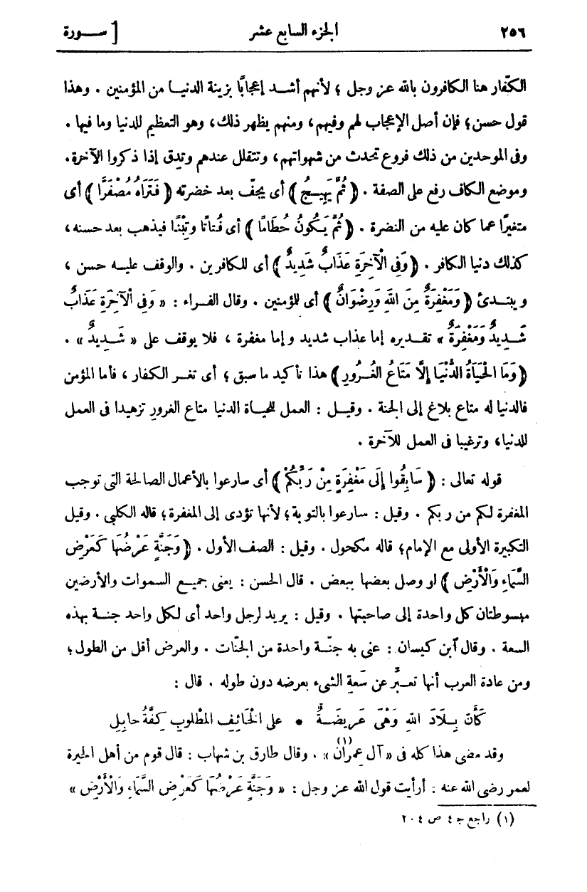 الْكُفَّارُ هُنَا الْكَافِرُونَ بِاللَّهِ عَزَّ وَجَلَّ، لِأَنَّهُمْ أَشَدُّ إِعْجَابًا بِزِينَةِ الدُّنْيَا مِنْ الْمُؤْمِنِينَ. وَهَذَا قَوْلٌ حَسَنٌ، فَإِنَّ أَصْلَ الْإِعْجَابِ لَهُمْ وَفِيهِمْ، وَمِنْهُمْ يَظْهَرُ ذَلِكَ، وَهُوَ التَّعْظِيمُ لِلدُّنْيَا وَمَا فِيهَا. وَفِي الْمُوَحِّدِينَ مِنْ ذَلِكَ فُرُوعٌ تَحْدُثُ مِنْ شَهَوَاتِهِمْ، وَتَتَقَلَّلُ عِنْدَهُمْ وَتَدِقُّ إِذَا ذَكَرُوا الْآخِرَةَ. وَمَوْضِعُ الْكَافِ رَفْعٌ عَلَى الصِّفَةِ. (ثُمَّ يَهِيجُ) أَيْ يَجِفُّ بَعْدَ خُضْرَتِهِ (فَتَراهُ مُصْفَرًّا) أَيْ مُتَغَيِّرًا عَمَّا كَانَ عَلَيْهِ مِنَ النُّضْرَةِ. (ثُمَّ يَكُونُ حُطاماً) أَيْ فُتَاتًا وَتِبْنًا فَيَذْهَبُ بَعْدَ حُسْنِهِ، كَذَلِكَ دُنْيَا الْكَافِرِ. (وَفِي الْآخِرَةِ عَذابٌ شَدِيدٌ) أَيْ لِلْكَافِرِينَ. وَالْوَقْفُ عَلَيْهِ حَسَنٌ، وَيَبْتَدِئُ (وَمَغْفِرَةٌ مِنَ اللَّهِ وَرِضْوانٌ) أَيْ لِلْمُؤْمِنِينَ. وَقَالَ الْفَرَّاءُ: (وَفِي الْآخِرَةِ عَذابٌ شَدِيدٌ وَمَغْفِرَةٌ) تَقْدِيرُهُ إِمَّا عَذَابٌ شَدِيدٌ وَإِمَّا مَغْفِرَةٌ، فَلَا يُوقَفُ عَلَى (شَدِيدٌ). (وَمَا الْحَياةُ الدُّنْيا إِلَّا مَتاعُ الْغُرُورِ) هَذَا تَأْكِيدُ مَا سَبَقَ، أَيْ تَغُرُّ الْكُفَّارَ، فَأَمَّا الْمُؤْمِنُ فَالدُّنْيَا لَهُ مَتَاعٌ بَلَاغٌ إِلَى الْجَنَّةِ. وَقِيلَ: الْعَمَلُ لِلْحَيَاةِ الدُّنْيَا مَتَاعُ الْغُرُورِ تَزْهِيدًا فِي الْعَمَلِ لِلدُّنْيَا، وَتَرْغِيبًا فِي الْعَمَلِ لِلْآخِرَةِ. قَوْلُهُ تَعَالَى: (سابِقُوا إِلى مَغْفِرَةٍ مِنْ رَبِّكُمْ) أَيْ سَارِعُوا بِالْأَعْمَالِ الصَّالِحَةِ الَّتِي تُوجِبُ الْمَغْفِرَةَ لَكُمْ مِنْ رَبِّكُمْ. وَقِيلَ: سَارِعُوا بِالتَّوْبَةِ، لِأَنَّهَا تُؤَدِّي إِلَى الْمَغْفِرَةِ، قَالَهُ الكلبي. وقيل التكبيرة الاولى مع الامام، قال مَكْحُولٌ. وَقِيلَ: الصَّفُّ الْأَوَّلُ. (وَجَنَّةٍ عَرْضُها كَعَرْضِ السَّماءِ وَالْأَرْضِ) لَوْ وُصِلَ بَعْضُهَا بِبَعْضٍ. قَالَ الحسن: يعني جميع السموات وَالْأَرَضِينَ مَبْسُوطَتَانِ كُلُّ وَاحِدَةٍ إِلَى صَاحِبَتِهَا. وَقِيلَ: يُرِيدُ لِرَجُلٍ وَاحِدٍ أَيْ لِكُلِ وَاحِدٍ جَنَّةٌ بِهَذِهِ السَّعَةِ. وَقَالَ ابْنُ كَيْسَانَ: عَنَى بِهِ جَنَّةً وَاحِدَةً مِنَ الْجَنَّاتِ. وَالْعَرْضُ أَقَلُّ مِنَ الطُّولِ، وَمِنْ عَادَةِ الْعَرَبِ أَنَّهَا تُعَبِّرُ عَنْ سَعَةِ الشَّيْءِ بِعَرْضِهِ دُونَ طُولِهِ. قَالَ: