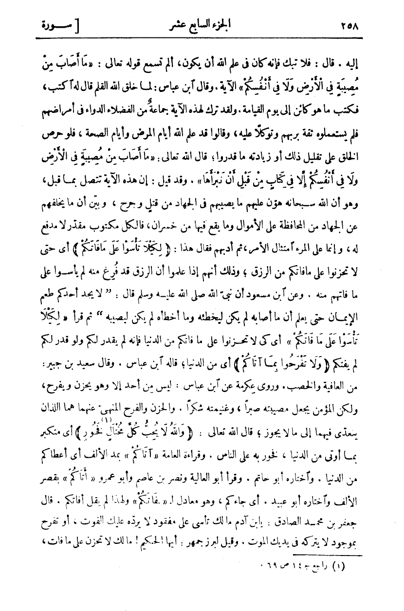 إِلَيْهِ. قَالَ: فَلَا تَبْكِ فَإِنَّهُ كَانَ فِي عِلْمِ اللَّهِ أَنْ يَكُونَ، أَلَمْ تَسْمَعْ قَوْلَهُ تَعَالَى: (مَا أَصابَ مِنْ مُصِيبَةٍ فِي الْأَرْضِ وَلا فِي أَنْفُسِكُمْ) الْآيَةَ. وَقَالَ ابْنُ عَبَّاسٍ: لَمَّا خَلَقَ اللَّهُ الْقَلَمَ قَالَ لَهُ اكْتُبْ، فَكَتَبَ مَا هُوَ كَائِنٌ إِلَى يَوْمِ الْقِيَامَةِ. وَلَقَدْ تَرَكَ لِهَذِهِ الْآيَةِ جَمَاعَةٌ مِنَ الْفُضَلَاءِ الدَّوَاءَ فِي أَمْرَاضِهِمْ فَلَمْ يَسْتَعْمِلُوهُ ثِقَةً بِرَبِّهِمْ وَتَوَكُّلًا عَلَيْهِ، وَقَالُوا قَدْ عَلِمَ اللَّهُ أَيَّامَ الْمَرَضِ وَأَيَّامَ الصِّحَّةِ، فَلَوْ حَرَصَ الْخَلْقُ عَلَى تَقْلِيلِ ذَلِكَ أَوْ زِيَادَتِهِ مَا قَدَرُوا، قَالَ اللَّهُ تَعَالَى: (مَا أَصابَ مِنْ مُصِيبَةٍ فِي الْأَرْضِ وَلا فِي أَنْفُسِكُمْ إِلَّا فِي كِتابٍ مِنْ قَبْلِ أَنْ نَبْرَأَها). وَقَدْ قِيلَ: إِنَّ هَذِهِ الْآيَةَ تَتَّصِلُ بِمَا قَبْلُ، وَهُوَ أَنَّ اللَّهَ سُبْحَانَهُ هَوَّنَ عَلَيْهِمْ مَا يُصِيبُهُمْ فِي الْجِهَادِ مِنْ قَتْلٍ وَجَرْحٍ، وَبَيَّنَ أَنَّ مَا يُخَلِّفُهُمْ عَنِ الْجِهَادِ مِنَ الْمُحَافَظَةِ عَلَى الْأَمْوَالِ وَمَا يَقَعُ فِيهَا مِنْ خُسْرَانٍ، فَالْكُلُّ مَكْتُوبٌ مُقَدَّرٌ لَا مَدْفَعَ لَهُ، وَإِنَّمَا عَلَى الْمَرْءِ امْتِثَالُ الْأَمْرِ، ثُمَّ أَدَّبَهُمْ فَقَالَ هَذَا: (لِكَيْلا تَأْسَوْا عَلى مَا فاتَكُمْ) أَيْ حَتَّى لَا تَحْزَنُوا عَلَى مَا فَاتَكُمْ مِنَ الرِّزْقِ، وَذَلِكَ أَنَّهُمْ إِذَا عَلِمُوا أَنَّ الرِّزْقَ قَدْ فُرِغَ مِنْهُ لَمْ يَأْسَوْا عَلَى مَا فَاتَهُمْ مِنْهُ. وَعَنِ ابْنِ مَسْعُودٍ أَنَّ نَبِيَّ اللَّهِ صَلَّى اللَّهُ عَلَيْهِ وَسَلَّمَ قَالَ: (لَا يَجِدُ أَحَدُكُمْ طَعْمَ الْإِيمَانِ حَتَّى يَعْلَمَ أَنَّ مَا أَصَابَهُ لَمْ يَكُنْ لِيُخْطِئَهُ وَمَا أَخْطَأَهُ لَمْ يَكُنْ لِيُصِيبَهُ) ثُمَّ قَرَأَ (لِكَيْلا تَأْسَوْا عَلى مَا فاتَكُمْ) أَيْ كَيْ لَا تَحْزَنُوا عَلَى مَا فَاتَكُمْ مِنَ الدُّنْيَا فَإِنَّهُ لَمْ يُقَدَّرْ لَكُمْ وَلَوْ قُدِّرَ لَكُمْ لَمْ يَفُتْكُمْ (وَلا تَفْرَحُوا بِما آتاكُمْ) أَيْ مِنَ الدُّنْيَا، قَالَهُ ابْنُ عَبَّاسٍ. وَقَالَ سَعِيدُ بْنُ جُبَيْرٍ: مِنَ الْعَافِيَةِ وَالْخِصْبِ. وَرَوَى عِكْرِمَةُ عَنِ ابْنِ عَبَّاسٍ: لَيْسَ مِنْ أَحَدٍ إِلَّا وَهُوَ يَحْزَنُ وَيَفْرَحُ، وَلَكِنَّ الْمُؤْمِنَ يَجْعَلُ مُصِيبَتَهُ صَبْرًا، وَغَنِيمَتَهُ شُكْرًا. وَالْحُزْنُ وَالْفَرَحُ الْمَنْهِيُّ عَنْهُمَا هُمَا اللَّذَانِ يُتَعَدَّى فِيهِمَا إلى مالا يجوز، قال الله تعالى: (وَاللَّهُ لا يُحِبُّ كُلَّ مُخْتالٍ «١» فَخُورٍ) أي متكبر بما أوتى من الدنيا، فخور به على الناس. وَقِرَاءَةُ الْعَامَّةِ (آتاكُمْ) بِمَدِّ الْأَلِفِ أَيْ أَعْطَاكُمْ مِنَ الدُّنْيَا. وَاخْتَارَهُ أَبُو حَاتِمٍ. وَقَرَأَ أَبُو الْعَالِيَةِ وَنَصْرُ بْنُ عَاصِمٍ وَأَبُو عَمْرٍو (أَتَاكُمْ) بِقَصْرِ الْأَلِفِ وَاخْتَارَهُ أَبُو عُبَيْدٍ. أَيْ جَاءَكُمْ، وَهُوَ مُعَادِلٌ لِ (فاتَكُمْ) وَلِهَذَا لَمْ يَقُلْ أَفَاتَكُمْ. قَالَ جَعْفَرُ بْنُ مُحَمَّدٍ الصَّادِقُ: يَا ابن آدم مالك تَأْسَى عَلَى مَفْقُودٍ لَا يَرُدُّهُ عَلَيْكَ الْفَوْتُ، أَوْ تَفْرَحُ بِمَوْجُودٍ لَا يَتْرُكُهُ فِي يَدَيْكَ الموت. وقيل لبرز جمهر: أَيُّهَا الْحَكِيمُ! مَالَكَ لَا تَحْزَنُ عَلَى مَا فات،