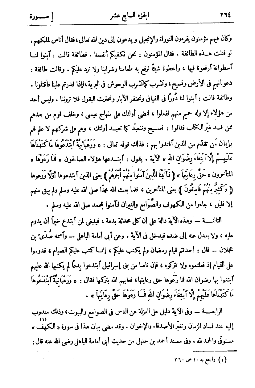 وَكَانَ فِيهِمْ مُؤْمِنُونَ يَقْرَءُونَ التَّوْرَاةَ وَالْإَنْجِيلَ وَيَدْعُونَ إِلَى دِينِ اللَّهِ تَعَالَى، فَقَالَ أُنَاسٌ لِمَلِكِهِمْ: لَوْ قَتَلْتَ هَذِهِ الطَّائِفَةَ. فَقَالَ الْمُؤْمِنُونَ: نَحْنُ نَكْفِيكُمْ أَنْفُسَنَا. فَطَائِفَةٌ قَالَتْ: ابْنُوا لَنَا أُسْطُوَانَةً ارْفَعُونَا فِيهَا، وَأَعْطَوْنَا شَيْئًا نَرْفَعُ بِهِ طَعَامَنَا وَشَرَابَنَا وَلَا نَرُدُّ عَلَيْكُمْ. وَقَالَتْ طَائِفَةٌ: دَعُونَا نَهِيمُ فِي الْأَرْضِ وَنَسِيحُ، وَنَشْرَبُ كَمَا تَشْرَبُ الْوُحُوشُ فِي الْبَرِيَّةِ، فَإِذَا قَدَرْتُمْ عَلَيْنَا فَاقْتُلُونَا. وَطَائِفَةٌ قَالَتْ: ابْنُوا لَنَا دُورًا فِي الْفَيَافِي ونحتفر الْآبَارَ وَنَحْتَرِثُ الْبُقُولَ فَلَا تَرَوْنَنَا. وَلَيْسَ أَحَدٌ مِنْ هَؤُلَاءِ إِلَّا وَلَهُ حَمِيمٌ مِنْهُمْ فَفَعَلُوا، فَمَضَى أُولَئِكَ عَلَى مِنْهَاجِ عِيسَى، وَخَلَفَ قَوْمٌ مِنْ بَعْدِهِمْ مِمَّنْ قَدْ غَيَّرَ الْكِتَابَ فَقَالُوا: نَسِيحُ وَنَتَعَبَّدُ كَمَا تَعَبَّدَ أُولَئِكَ، وَهُمْ عَلَى شِرْكِهِمْ لَا عِلْمَ لَهُمْ بِإِيمَانِ مَنْ تَقَدَّمَ مِنَ الَّذِينَ اقْتَدَوْا بِهِمْ، فَذَلِكَ قَوْلُهُ تَعَالَى: (وَرَهْبانِيَّةً ابْتَدَعُوها مَا كَتَبْناها عَلَيْهِمْ إِلَّا ابْتِغاءَ رِضْوانِ اللَّهِ) الْآيَةَ. يَقُولُ: ابْتَدَعَهَا هَؤُلَاءِ الصَّالِحُونَ (فَما رَعَوْها) الْمُتَأَخِّرُونَ (حَقَّ رِعايَتِها) (فَآتَيْنَا الَّذِينَ آمَنُوا مِنْهُمْ أَجْرَهُمْ) يَعْنِي الَّذِينَ ابْتَدَعُوهَا أَوَّلًا وَرَعَوْهَا (وَكَثِيرٌ مِنْهُمْ فاسِقُونَ) يَعْنِي الْمُتَأَخِّرِينَ، فَلَمَّا بَعَثَ اللَّهُ مُحَمَّدًا صَلَّى اللَّهُ عَلَيْهِ وَسَلَّمَ وَلَمْ يَبْقَ مِنْهُمْ إِلَّا قَلِيلٌ، جَاءُوا مِنَ الْكُهُوفِ وَالصَّوَامِعِ وَالْغِيرَانِ فَآمَنُوا بِمُحَمَّدٍ صَلَّى اللَّهُ عَلَيْهِ وَسَلَّمَ. الثَّالِثَةُ- وَهَذِهِ الْآيَةُ دَالَّةٌ عَلَى أَنَّ كُلَّ مُحْدَثَةٍ بِدْعَةٌ، فَيَنْبَغِي لِمَنِ ابْتَدَعَ خَيْرًا أَنْ يَدُومَ عَلَيْهِ، وَلَا يَعْدِلَ عَنْهُ إِلَى ضِدِّهِ فَيَدْخُلُ فِي الْآيَةِ. وَعَنْ أَبِي أُمَامَةَ الْبَاهِلِيِّ- وَاسْمُهُ صُدَيُّ بْنُ عَجْلَانَ- قَالَ: أَحْدَثْتُمْ قِيَامَ رَمَضَانَ وَلَمْ يُكْتَبْ عَلَيْكُمْ، إِنَّمَا كُتِبَ عَلَيْكُمُ الصِّيَامُ، فَدُومُوا عَلَى الْقِيَامِ إِذْ فَعَلْتُمُوهُ وَلَا تَتْرُكُوهُ، فَإِنَّ نَاسًا مِنْ بَنِي إِسْرَائِيلَ ابْتَدَعُوا بِدَعًا لَمْ يَكْتُبْهَا اللَّهُ عَلَيْهِمُ ابْتَغَوْا بِهَا رِضْوَانَ اللَّهِ فَمَا رَعَوْهَا حَقَّ رِعَايَتِهَا، فَعَابَهُمُ اللَّهُ بِتَرْكِهَا فَقَالَ: (وَرَهْبانِيَّةً ابْتَدَعُوها مَا كَتَبْناها عَلَيْهِمْ إِلَّا ابْتِغاءَ رِضْوانِ اللَّهِ فَما رَعَوْها حَقَّ رِعايَتِها). الرَّابِعَةُ- وَفِي الْآيَةِ دَلِيلٌ عَلَى الْعُزْلَةِ عَنِ النَّاسِ فِي الصَّوَامِعِ وَالْبُيُوتِ، وَذَلِكَ مَنْدُوبٌ إِلَيْهِ عِنْدَ فَسَادِ الزَّمَانِ وَتَغَيُّرِ الْأَصْدِقَاءِ وَالْإِخْوَانِ. وَقَدْ مَضَى بَيَانُ هَذَا فِي سُورَةِ (الْكَهْفِ) «١» مُسْتَوْفًى وَالْحَمْدُ لِلَّهِ. وَفِي مُسْنَدِ أَحْمَدَ بْنِ حَنْبَلٍ مِنْ حَدِيثِ أَبِي أُمَامَةَ الْبَاهِلِيِّ رَضِيَ اللَّهُ عَنْهُ قَالَ: