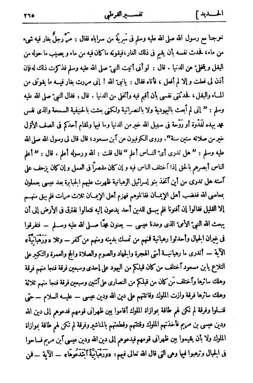 خَرَجْنَا مَعَ رَسُولِ اللَّهِ صَلَّى اللَّهُ عَلَيْهِ وَسَلَّمَ فِي سَرِيَّةٍ مِنْ سَرَايَاهُ فَقَالَ: مَرَّ رجل بغار فيه شي مِنْ مَاءٍ، فَحَدَّثَ نَفْسَهُ بِأَنْ يُقِيمَ فِي ذَلِكَ الْغَارِ، فَيَقُوتُهُ مَا كَانَ فِيهِ مِنْ مَاءٍ وَيُصِيبُ مَا حَوْلَهُ مِنَ الْبَقْلِ وَيَتَخَلَّى عَنِ الدُّنْيَا. قَالَ: لَوْ أَنِّي أَتَيْتُ النَّبِيَّ صَلَّى اللَّهُ عَلَيْهِ وَسَلَّمَ فَذَكَرْتُ ذَلِكَ لَهُ فَإِنْ أَذِنَ لِي فَعَلْتُ وَإِلَّا لَمْ أَفْعَلْ، فأتاه فقال: يا نبى الله! انى مرت بِغَارٍ فِيهِ مَا يَقُوتُنِي مِنَ الْمَاءِ وَالْبَقْلِ، فَحَدَّثَتْنِي نَفْسِي بِأَنْ أُقِيمَ فِيهِ وَأَتَخَلَّى مِنَ الدُّنْيَا. قَالَ: فَقَالَ النَّبِيُّ صَلَّى اللَّهُ عَلَيْهِ وَسَلَّمَ: (م أُبْعَثْ بِالْيَهُودِيَّةِ وَلَا بِالنَّصْرَانِيَّةِ وَلَكِنِّي بُعِثْتُ بِالْحَنِيفِيَّةِ السَّمْحَةِ وَالَّذِي نَفْسُ مُحَمَّدٍ بِيَدِهِ لَغَدْوَةٌ أَوْ رَوْحَةٌ فِي سَبِيلِ اللَّهِ خَيْرٌ مِنَ الدُّنْيَا وَمَا فِيهَا وَلَمَقَامُ أَحَدِكُمْ فِي الصَّفِّ الْأَوَّلِ خَيْرٌ مِنْ صَلَاتِهِ سِتِّينَ سَنَةً (. وَرَوَى الْكُوفِيُّونَ عَنِ ابْنِ مَسْعُودٍ، قَالَ قَالَ لِي رَسُولُ اللَّهِ صَلَّى اللَّهُ عَلَيْهِ وَسَلَّمَ: (هَلْ تَدْرِي أَيُّ النَّاسِ أَعْلَمُ) قَالَ قُلْتُ: اللَّهُ وَرَسُولُهُ أَعْلَمُ. قَالَ: (أَعْلَمُ النَّاسِ أَبْصَرُهُمْ بِالْحَقِّ إِذَا اخْتَلَفَ النَّاسُ فِيهِ وَإِنْ كَانَ مُقَصِّرًا فِي الْعَمَلِ وَإِنْ كَانَ يَزْحَفُ عَلَى اسْتِهِ هَلْ تَدْرِي مِنْ أَيْنَ اتَّخَذَ بَنُو إِسْرَائِيلَ الرَّهْبَانِيَّةَ ظَهَرَتْ عَلَيْهِمُ الْجَبَابِرَةُ بَعْدَ عِيسَى يَعْمَلُونَ بِمَعَاصِي اللَّهِ فَغَضِبَ أَهْلُ الْإِيمَانِ فَقَاتَلُوهُمْ فَهُزِمَ أَهْلُ الْإِيمَانِ ثَلَاثَ مَرَّاتٍ فَلَمْ يَبْقَ مِنْهُمْ إِلَّا الْقَلِيلُ فَقَالُوا إِنْ أَفَنَوْنَا فَلَمْ يَبْقَ لِلدِّينِ أَحَدٌ يَدْعُونَ إِلَيْهِ فَتَعَالَوْا نَفْتَرِقُ فِي الْأَرْضِ إِلَى أَنْ يَبْعَثَ اللَّهُ النَّبِيَّ الْأُمِّيَّ الَّذِي وَعَدَنَا عِيسَى- يَعْنُونَ مُحَمَّدًا صَلَّى اللَّهُ عَلَيْهِ وَسَلَّمَ- فَتَفَرَّقُوا فِي غِيرَانِ الْجِبَالِ وَأَحْدَثُوا رَهْبَانِيَّةً فَمِنْهُمْ مَنْ تَمَسَّكَ بِدِينِهِ وَمِنْهُمْ مَنْ كَفَرَ- وَتَلَا (وَرَهْبانِيَّةً) الْآيَةَ- أَتَدْرِي مَا رَهْبَانِيَّةُ أُمَّتِي الهجرة والجهاد والصوم والصلاة وَالْحَجُّ وَالْعُمْرَةُ وَالتَّكْبِيرُ عَلَى التِّلَاعِ يَا ابْنَ مَسْعُودٍ اخْتَلَفَ مَنْ كَانَ قَبْلَكُمْ مِنَ الْيَهُودِ عَلَى إِحْدَى وَسَبْعِينَ فِرْقَةً فَنَجَا مِنْهُمْ فِرْقَةٌ وَهَلَكَ سَائِرُهَا وَاخْتَلَفَ مَنْ كَانَ مِنْ قَبْلِكُمْ مِنَ النَّصَارَى عَلَى اثْنَيْنِ وَسَبْعِينَ فِرْقَةً فَنَجَا مِنْهُمْ ثَلَاثَةٌ وَهَلَكَ سَائِرُهَا فِرْقَةٌ وَازَتِ الْمُلُوكَ وَقَاتَلَتْهُمْ عَلَى دِينِ اللَّهِ وَدِينِ عِيسَى- عَلَيْهِ السَّلَامُ- حَتَّى قُتِلُوا وَفِرْقَةٌ لَمْ تَكُنْ لَهُمْ طَاقَةٌ بِمُوَازَاةِ الْمُلُوكِ أَقَامُوا بَيْنَ ظَهْرَانَيْ قَوْمِهِمْ فدعوهم إلى دين الله ودين عيسى بن مَرْيَمَ فَأَخَذَتْهُمُ الْمُلُوكُ وَقَتَلَتْهُمْ وَقَطَّعَتْهُمْ بِالْمَنَاشِيرِ وَفِرْقَةٌ لَمْ تَكُنْ لَهُمْ طَاقَةٌ بِمُوَازَاةِ الْمُلُوكِ وَلَا بِأَنْ يُقِيمُوا بَيْنَ ظَهْرَانَيْ قَوْمِهِمْ فَيَدْعُوهُمْ إِلَى دِينِ اللَّهِ وَدِينِ عِيسَى ابْنِ مَرْيَمَ فَسَاحُوا فِي الْجِبَالِ وَتَرَهَّبُوا فِيهَا وَهِيَ الَّتِي قَالَ اللَّهُ تَعَالَى فِيهِمْ: (وَرَهْبانِيَّةً ابْتَدَعُوها) الْآيَةَ- فَمَنْ