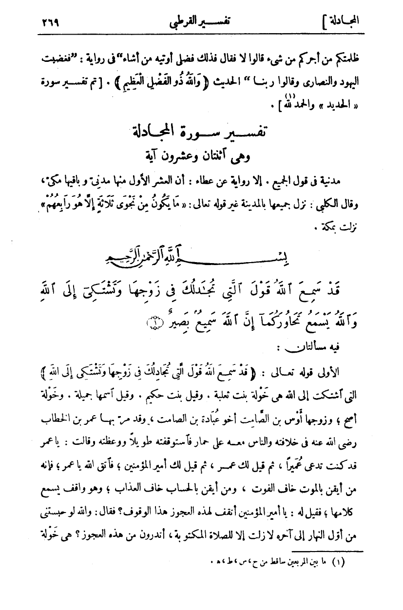 قَدْ سَمِعَ اللَّهُ قَوْلَ الَّتِي تُجادِلُكَ فِي زَوْجِها وَتَشْتَكِي إِلَى اللَّهِ وَاللَّهُ يَسْمَعُ تَحاوُرَكُما إِنَّ اللَّهَ سَمِيعٌ بَصِيرٌ (١)