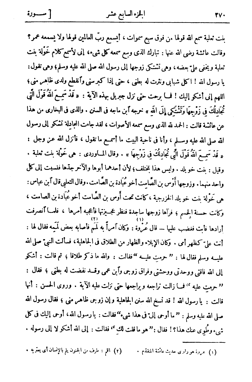 بِنْتُ ثَعْلَبَةَ سَمِعَ اللَّهُ قَوْلَهَا مِنْ فَوْقِ سَبْعِ سَمَوَاتٍ، أَيَسْمَعُ رَبُّ الْعَالَمِينَ قَوْلَهَا وَلَا يَسْمَعُهُ عُمَرُ؟ وَقَالَتْ عَائِشَةُ رَضِيَ اللَّهُ عَنْهَا: تبارك الذي وسع سمعه كل شي، إِنِّي لَأَسْمَعَ كَلَامَ خَوْلَةَ بِنْتِ ثَعْلَبَةَ وَيَخْفَى عَلَيَّ بَعْضُهُ، وَهِيَ تَشْتَكِي زَوْجَهَا إِلَى رَسُولِ اللَّهِ صَلَّى اللَّهُ عَلَيْهِ وَسَلَّمَ، وَهِيَ تَقُولُ: يَا رَسُولَ اللَّهِ! أَكَلَ شَبَابِي وَنَثَرْتُ لَهُ بَطْنِي، حَتَّى إِذَا كَبِرَ سِنِّي وَانْقَطَعَ وَلَدِي ظَاهَرَ مِنِّي، اللَّهُمَّ إِنِّي أَشْكُو إِلَيْكَ! فَمَا بَرِحَتْ حَتَّى نَزَلَ جِبْرِيلُ بِهَذِهِ الْآيَةِ: (قَدْ سَمِعَ اللَّهُ قَوْلَ الَّتِي تُجادِلُكَ فِي زَوْجِها وَتَشْتَكِي إِلَى اللَّهِ) خَرَّجَهُ ابْنُ مَاجَهْ فِي السُّنَنِ. وَالَّذِي فِي الْبُخَارِيِّ مِنْ هَذَا عَنْ عَائِشَةَ قَالَتْ: الْحَمْدُ لِلَّهِ الَّذِي وَسِعَ سَمْعُهُ الْأَصْوَاتَ، لَقَدْ جَاءَتِ الْمُجَادِلَةُ تَشْكُو إِلَى رَسُولِ اللَّهِ صَلَّى اللَّهُ عَلَيْهِ وَسَلَّمَ، وَأَنَا فِي نَاحِيَةِ الْبَيْتِ مَا أَسْمَعُ مَا تَقُولُ، فَأَنْزَلَ اللَّهُ عَزَّ وَجَلَّ: (قَدْ سَمِعَ اللَّهُ قَوْلَ الَّتِي تُجادِلُكَ فِي زَوْجِها). وَقَالَ الْمَاوَرْدِيُّ: هِيَ خَوْلَةُ بِنْتُ ثَعْلَبَةَ. وَقِيلَ: بِنْتُ خُوَيْلِدٍ. وَلَيْسَ هَذَا بِمُخْتَلَفٍ، لِأَنَّ أَحَدَهُمَا أَبُوهَا وَالْآخَرُ جَدُّهَا فَنُسِبَتْ إِلَى كُلِّ وَاحِدٍ مِنْهُمَا. وَزَوْجُهَا أَوْسُ بْنُ الصَّامِتِ أَخُو عُبَادَةَ بْنِ الصَّامِتِ. وَقَالَ الثَّعْلَبِيُّ قَالَ ابْنُ عَبَّاسٍ: هِيَ خَوْلَةُ بِنْتُ خُوَيْلِدٍ الْخَزْرَجِيَّةُ، كَانَتْ تَحْتَ أَوْسِ بْنِ الصَّامِتِ أَخُو عُبَادَةَ بْنِ الصَّامِتِ، وَكَانَتْ حَسَنَةَ الْجِسْمِ، فَرَآهَا زَوْجُهَا سَاجِدَةً فَنَظَرَ عَجِيزَتَهَا فَأَعْجَبَهُ أَمْرُهَا، فَلَمَّا انْصَرَفَتْ أَرَادَهَا فَأَبَتْ فَغَضِبَ عَلَيْهَا- قَالَ عُرْوَةُ «١»: وَكَانَ امْرَأً بِهِ لَمَمٌ «٢» فَأَصَابَهُ بَعْضُ لَمَمِهِ فَقَالَ لَهَا: أَنْتِ عَلَيَّ كَظَهْرِ أُمِّي. وَكَانَ الْإِيلَاءُ وَالظِّهَارُ مِنَ الطَّلَاقِ فِي الْجَاهِلِيَّةِ، فَسَأَلَتِ النَّبِيَّ صَلَّى اللَّهُ عَلَيْهِ وَسَلَّمَ فَقَالَ لَهَا: (حَرُمْتِ عَلَيْهِ) فَقَالَتْ: وَاللَّهِ مَا ذَكَرَ طَلَاقًا، ثُمَّ قَالَتْ: أَشْكُو إِلَى اللَّهِ فَاقَتِي وَوَحْدَتِي وَوَحْشَتِي وَفِرَاقَ زَوْجِي وَابْنَ عَمِّي وَقَدْ نَفَضْتُ لَهُ بَطْنِي، فَقَالَ: (حَرُمْتِ عَلَيْهِ) فَمَا زالت تراجعه ومراجعها حَتَّى نَزَلَتْ عَلَيْهِ الْآيَةُ. وَرَوَى الْحَسَنُ: أَنَّهَا قَالَتْ: يَا رَسُولَ اللَّهِ! قَدْ نَسَخَ اللَّهُ سُنَنَ الْجَاهِلِيَّةِ وَإِنَّ زَوْجِي ظَاهَرَ مِنِّي، فَقَالَ رَسُولُ اللَّهِ صَلَّى اللَّهُ عَلَيْهِ وَسَلَّمَ: (ما أوحى إلي في هذا شي) فَقَالَتْ: يَا رَسُولَ اللَّهِ، أُوحِيَ إِلَيْكَ فِي كل شي وَطُوِيَ عَنْكَ هَذَا؟! فَقَالَ: (هُوَ مَا قُلْتُ لَكِ) فَقَالَتْ: إِلَى اللَّهِ أَشْكُو لَا إِلَى رسوله.