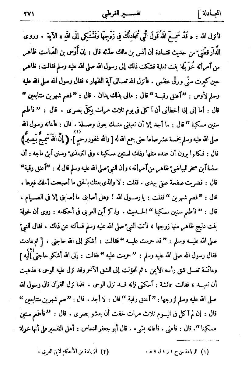 فَأَنْزَلَ اللَّهُ: (قَدْ سَمِعَ اللَّهُ قَوْلَ الَّتِي تُجادِلُكَ فِي زَوْجِها وَتَشْتَكِي إِلَى اللَّهِ) الْآيَةَ. وَرَوَى الدَّارَقُطْنِيُّ مِنْ حَدِيثِ قَتَادَةَ أَنَّ أَنَسَ بْنَ مَالِكٍ حَدَّثَهُ قَالَ: إِنَّ أَوْسَ بْنَ الصَّامِتِ ظَاهَرَ مِنِ امْرَأَتِهِ خُوَيْلَةَ بِنْتِ ثَعْلَبَةَ فَشَكَتْ ذَلِكَ إِلَى رَسُولِ اللَّهِ صَلَّى اللَّهُ عَلَيْهِ وَسَلَّمَ فَقَالَتْ: ظَاهَرَ حِينَ كَبِرَتْ سِنِّي وَرَقَّ عَظْمِي. فَأَنْزَلَ اللَّهُ تَعَالَى آيَةَ الظِّهَارِ، فَقَالَ رَسُولُ اللَّهِ صَلَّى اللَّهُ عَلَيْهِ وَسَلَّمَ لِأَوْسٍ: (اعْتِقْ رَقَبَةً) قَالَ: مَالِي بِذَلِكَ يَدَانِ. قَالَ: (فَصُمْ شَهْرَيْنِ مُتَتَابِعَيْنِ) قَالَ: أَمَا إِنِّي إِذَا أَخْطَأَنِي أَنْ آكُلَ فِي يَوْمٍ ثَلَاثَ مَرَّاتٍ يَكِلُّ بَصَرِي. قَالَ: (فَأَطْعِمْ سِتِّينَ مِسْكِينًا) قَالَ: مَا أَجِدُ إِلَّا أَنْ تُعِينَنِي مِنْكَ بِعَوْنٍ وَصِلَةٍ. قَالَ: فَأَعَانَهُ رَسُولُ اللَّهِ صَلَّى اللَّهُ عَلَيْهِ وَسَلَّمَ بِخَمْسَةَ عَشَرَ صَاعًا حَتَّى جَمَعَ اللَّهُ لَهُ [وَاللَّهُ غَفُورٌ رَحِيمٌ «١»]. (إِنَّ اللَّهَ سَمِيعٌ بَصِيرٌ) قَالَ: فَكَانُوا يَرَوْنَ أَنَّ عِنْدَهُ مِثْلَهَا وَذَلِكَ لِسِتِّينَ مِسْكِينًا، وَفِي التِّرْمِذِيِّ وسنن ابن ماجة: أن سلمة ابن صَخْرٍ الْبَيَاضِيَّ ظَاهَرَ مِنِ امْرَأَتِهِ، وَأَنَّ النَّبِيَّ صَلَّى اللَّهُ عَلَيْهِ وَسَلَّمَ قَالَ لَهُ: (اعْتِقْ رَقَبَةً) قَالَ: فَضَرَبْتُ صَفْحَةَ عُنُقِي بِيَدِي. فَقُلْتُ: لَا وَالَّذِي بَعَثَكَ بِالْحَقِّ مَا أَصْبَحْتُ أَمْلِكُ غَيْرَهَا. قَالَ: (فَصُمْ شَهْرَيْنِ) فَقُلْتُ: يَا رَسُولَ اللَّهِ! وَهَلْ أَصَابَنِي مَا أَصَابَنِي إِلَّا فِي الصِّيَامِ. قَالَ: (فَأَطْعِمْ سِتِّينَ مِسْكِينًا) الْحَدِيثَ. وَذَكَرَ ابْنُ الْعَرَبِيِّ فِي أَحْكَامِهِ: رُوِيَ أَنَّ خَوْلَةَ بنت دليج ظَاهَرَ مِنْهَا زَوْجُهَا، فَأَتَتِ النَّبِيَّ صَلَّى اللَّهُ عَلَيْهِ وَسَلَّمَ فَسَأَلَتْهُ عَنْ ذَلِكَ. فَقَالَ النَّبِيُّ صَلَّى اللَّهُ عَلَيْهِ وَسَلَّمَ: (قَدْ حَرُمْتِ عَلَيْهِ) فَقَالَتْ: أَشْكُو إِلَى اللَّهِ حَاجَتِي. [ثُمَّ عَادَتْ فَقَالَ رَسُولُ اللَّهِ صَلَّى اللَّهُ عَلَيْهِ وَسَلَّمَ: (حَرُمْتِ عَلَيْهِ) فَقَالَتْ: إِلَى اللَّهِ أَشْكُو حَاجَتِي إِلَيْهِ «٢»] وَعَائِشَةُ تَغْسِلُ شِقَّ رَأْسِهِ الْأَيْمَنَ، ثُمَّ تَحَوَّلَتْ إِلَى الشِّقِّ الْآخَرِ وَقَدْ نَزَلَ عَلَيْهِ الْوَحْيُ، فَذَهَبَتْ أَنْ تُعِيدَ، فَقَالَتْ عَائِشَةُ: اسْكُتِي فَإِنَّهُ قَدْ نَزَلَ الْوَحْيُ. فَلَمَّا نَزَلَ الْقُرْآنُ قَالَ رَسُولُ اللَّهِ صَلَّى اللَّهُ عَلَيْهِ وَسَلَّمَ لِزَوْجِهَا: (اعْتِقْ رَقَبَةً) قَالَ: لَا أَجِدُ. قَالَ: (صُمْ شَهْرَيْنِ مُتَتَابِعَيْنِ) قَالَ: إِنْ لَمْ آكُلْ فِي الْيَوْمِ ثَلَاثَ مَرَّاتٍ خِفْتُ أَنْ يَعْشُوَ بَصَرِي. قَالَ: (فَأَطْعِمْ سِتِّينَ مِسْكِينًا). قَالَ: فَأَعِنِّي. فَأَعَانَهُ بِشَيْءٍ. قَالَ أَبُو جَعْفَرٍ النَّحَّاسُ: أَهْلُ التفسير على أنها خولة