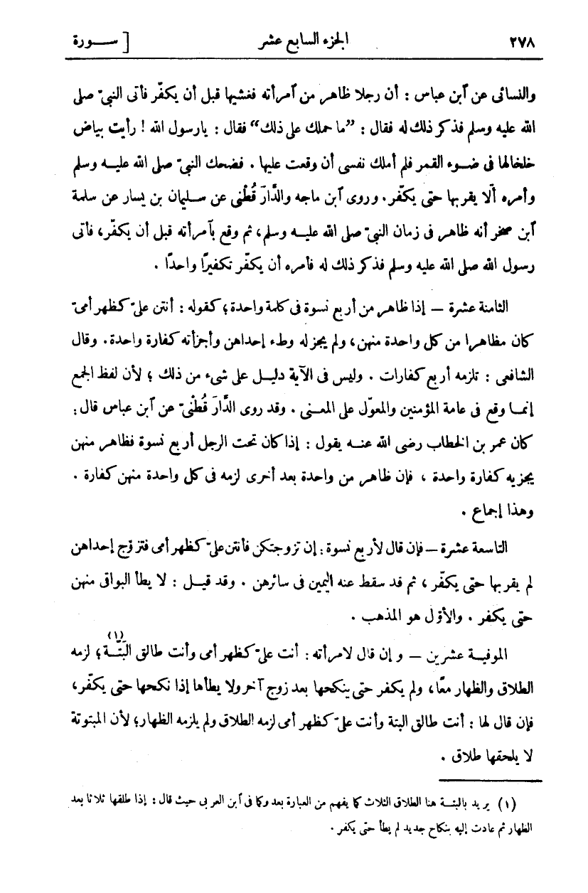 وَالنَّسَائِيُّ عَنِ ابْنِ عَبَّاسٍ: أَنَّ رَجُلًا ظَاهَرَ مِنِ امْرَأَتِهِ فَغَشِيَهَا قَبْلَ أَنْ يُكَفِّرَ فَأَتَى النَّبِيُّ صَلَّى اللَّهُ عَلَيْهِ وَسَلَّمَ فَذَكَرَ ذَلِكَ لَهُ فَقَالَ: (مَا حَمَلَكَ عَلَى ذَلِكَ) فَقَالَ: يَا رَسُولَ اللَّهِ! رَأَيْتُ بَيَاضَ خَلْخَالِهَا فِي ضَوْءِ الْقَمَرِ فَلَمْ أَمْلِكْ نَفْسِي أَنْ وَقَعْتُ عَلَيْهَا. فَضَحِكَ النَّبِيُّ صَلَّى اللَّهُ عَلَيْهِ وَسَلَّمَ وَأَمَرَهُ أَلَّا يَقْرَبَهَا حَتَّى يُكَفِّرَ. وَرَوَى ابْنُ مَاجَهْ وَالدَّارَقُطْنِيُّ عَنْ سُلَيْمَانَ بْنِ يَسَارٍ عَنْ سلمة ابن صَخْرٍ أَنَّهُ ظَاهَرَ فِي زَمَانِ النَّبِيِّ صَلَّى اللَّهُ عَلَيْهِ وَسَلَّمَ، ثُمَّ وَقَعَ بِامْرَأَتِهِ قَبْلَ أَنْ يُكَفِّرَ، فَأَتَى رَسُولِ اللَّهِ صَلَّى اللَّهُ عَلَيْهِ وَسَلَّمَ فَذُكِرَ ذَلِكَ لَهُ فَأَمَرَهُ أَنْ يُكَفِّرَ تَكْفِيرًا وَاحِدًا. الثَّامِنَةُ عَشْرَةَ- إِذَا ظَاهَرَ مِنْ أَرْبَعِ نِسْوَةٍ فِي كَلِمَةٍ وَاحِدَةٍ، كَقَوْلِهِ: أَنْتُنَّ عَلَيَّ كَظَهْرِ أُمِّي كَانَ مُظَاهِرًا مِنْ كل واحدة منهن، ولم يجز له وطئ إِحْدَاهُنَّ وَأَجْزَأَتْهُ كَفَّارَةٌ وَاحِدَةٌ. وَقَالَ الشَّافِعِيُّ: تَلْزَمُهُ أَرْبَعُ كَفَّارَاتٍ. وَلَيْسَ فِي الْآيَةِ دَلِيلٌ عَلَى شي مِنْ ذَلِكَ، لِأَنَّ لَفْظَ الْجَمْعِ إِنَّمَا وَقَعَ فِي عَامَّةِ الْمُؤْمِنِينَ وَالْمُعَوَّلُ عَلَى الْمَعْنَى. وَقَدْ رَوَى الدَّارَقُطْنِيُّ عَنِ ابْنِ عَبَّاسٍ قَالَ: كَانَ عُمَرُ بْنُ الْخَطَّابِ رَضِيَ اللَّهُ عَنْهُ يقول: إِذَا كَانَ تَحْتَ الرَّجُلِ أَرْبَعُ نِسْوَةٍ فَظَاهَرَ مِنْهُنَّ يَجْزِيهِ كَفَّارَةٌ وَاحِدَةٌ، فَإِنْ ظَاهَرَ مِنْ وَاحِدَةٍ بَعْدَ أُخْرَى لَزِمَهُ فِي كُلِّ وَاحِدَةٍ مِنْهُنَّ كَفَّارَةٌ. وَهَذَا إِجْمَاعٌ. التَّاسِعَةُ عَشْرَةَ- فَإِنْ قَالَ لِأَرْبَعِ نِسْوَةٍ: إِنْ تَزَوَّجْتُكُنَّ فَأَنْتُنَّ عَلَيَّ كَظَهْرِ أُمِّي فَتَزَوَّجَ إِحْدَاهُنَّ لَمْ يَقْرَبْهَا حَتَّى يُكَفِّرَ، ثُمَّ قَدْ سَقَطَ عَنْهُ الْيَمِينُ فِي سَائِرِهِنَّ. وَقَدْ قِيلَ: لَا يَطَأُ الْبَوَاقِيَ مِنْهُنَّ حَتَّى يُكَفِّرَ. وَالْأَوَّلُ هُوَ الْمَذْهَبُ. الْمُوَفِّيَةُ عِشْرِينَ: وَإِنْ قَالَ لِامْرَأَتِهِ: أَنْتِ عَلَيَّ كَظَهْرِ أُمِّي وَأَنْتِ طَالِقٌ الْبَتَّةَ «١»، لَزِمَهُ الطَّلَاقُ وَالظِّهَارُ مَعًا، وَلَمْ يُكَفِّرْ حَتَّى يَنْكِحَهَا بَعْدَ زَوْجٍ آخَرَ وَلَا يَطَأْهَا إِذَا نَكَحَهَا حَتَّى يُكَفِّرَ، فَإِنْ قَالَ لَهَا: أَنْتِ طَالِقٌ الْبَتَّةَ وَأَنْتِ عَلَيَّ كَظَهْرِ أُمِّي لَزِمَهُ الطَّلَاقُ وَلَمْ يَلْزَمْهُ الظِّهَارُ، لان المبتوتة لا يلحقها طلاق.