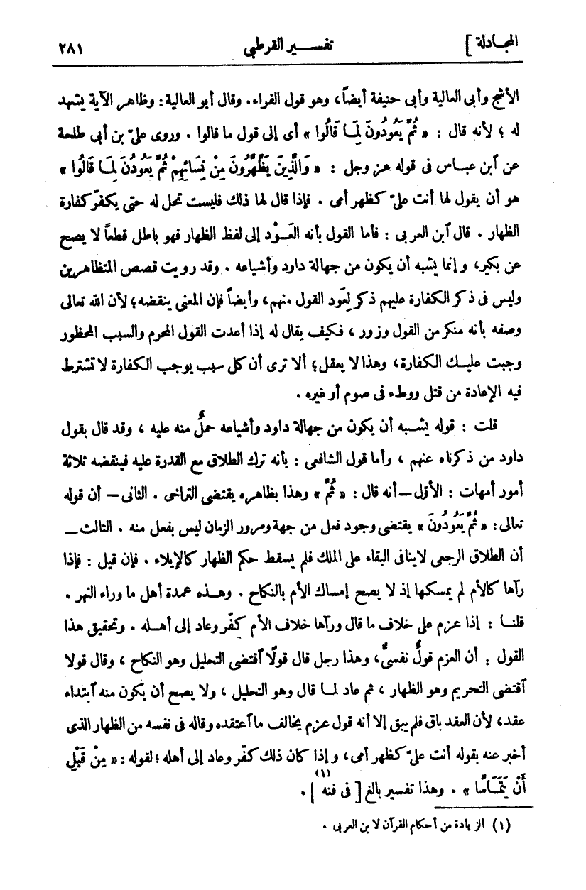 اعْتَقَدَهُ وَقَالَهُ فِي نَفْسِهِ مِنَ الظِّهَارِ الَّذِي أَخْبَرَ عَنْهُ بِقَوْلِهِ أَنْتِ عَلَيَّ كَظَهْرِ أُمِّي، وَإِذَا كَانَ ذَلِكَ كَفَّرَ وَعَادَ إِلَى أَهْلِهِ، لِقَوْلِهِ: (مِنْ قَبْلِ أَنْ يَتَمَاسَّا). وَهَذَا تَفْسِيرٌ بَالِغٌ [فِي فنه «١»].