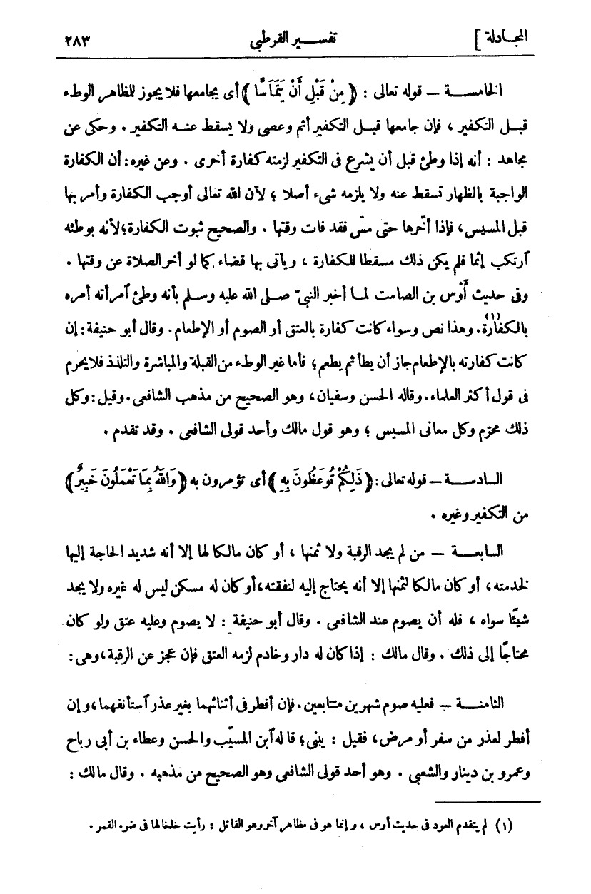 الْخَامِسَةُ- قَوْلُهُ تَعَالَى: (مِنْ قَبْلِ أَنْ يَتَمَاسَّا) أي يجامعها فلا يجوز للمظاهر الوطي قَبْلَ التَّكْفِيرِ، فَإِنْ جَامَعَهَا قَبْلَ التَّكْفِيرِ أَثِمَ وَعَصَى وَلَا يَسْقُطُ عَنْهُ التَّكْفِيرُ. وَحُكِيَ عَنْ مُجَاهِدٍ: أَنَّهُ إِذَا وَطِئَ قَبْلَ أَنْ يَشْرَعَ فِي التَّكْفِيرِ لَزِمَتْهُ كَفَّارَةٌ أُخْرَى. وَعَنْ غَيْرِهِ: أَنَّ الْكَفَّارَةَ الْوَاجِبَةَ بِالظِّهَارِ تَسْقُطُ عَنْهُ وَلَا يلزمه شي أَصْلًا، لِأَنَّ اللَّهَ تَعَالَى أَوْجَبَ الْكَفَّارَةَ وَأَمَرَ بِهَا قَبْلَ الْمَسِيسِ، فَإِذَا أَخَّرَهَا حَتَّى مَسَّ فَقَدْ فَاتَ وَقْتُهَا. وَالصَّحِيحُ ثُبُوتُ الْكَفَّارَةِ، لِأَنَّهُ بِوَطْئِهِ ارْتَكَبَ إِثْمًا فَلَمْ يَكُنْ ذَلِكَ مُسْقِطًا لِلْكَفَّارَةِ، وَيَأْتِي بِهَا قَضَاءً كَمَا لَوْ أَخَّرَ الصَّلَاةَ عَنْ وَقْتِهَا. وَفِي حَدِيثِ أَوْسِ بْنِ الصَّامِتِ لَمَّا أَخْبَرَ النَّبِيُّ صَلَّى اللَّهُ عَلَيْهِ وَسَلَّمَ بِأَنَّهُ وَطِئَ امْرَأَتَهُ أَمَرَهُ بِالْكَفَّارَةِ «١». وَهَذَا نَصٌّ وَسَوَاءٌ كَانَتْ كَفَّارَةً بِالْعِتْقِ أَوِ الصَّوْمِ أَوِ الْإِطْعَامِ. وَقَالَ أَبُو حَنِيفَةَ: إِنْ كَانَتْ كَفَّارَتُهُ بِالْإِطْعَامِ جَازَ أَنْ يَطَأَ ثُمَّ يُطْعِمَ، فأما غير الوطي مِنَ الْقُبْلَةِ وَالْمُبَاشَرَةِ وَالتَّلَذُّذِ فَلَا يَحْرُمُ فِي قَوْلِ أَكْثَرِ الْعُلَمَاءِ. وَقَالَهُ الْحَسَنُ وَسُفْيَانُ، وَهُوَ الصَّحِيحُ مِنْ مَذْهَبِ الشَّافِعِيِّ. وَقِيلَ: وَكُلُّ ذَلِكَ مُحَرَّمٌ وَكُلُّ مَعَانِي الْمَسِيسِ، وَهُوَ قَوْلُ مَالِكٍ وَأَحَدُ قَوْلَيِ الشَّافِعِيِّ. وَقَدْ تَقَدَّمَ. السَّادِسَةُ- قَوْلُهُ تَعَالَى: (ذلِكُمْ تُوعَظُونَ بِهِ) أَيْ تُؤْمَرُونَ بِهِ (وَاللَّهُ بِما تَعْمَلُونَ خَبِيرٌ) مِنَ التَّكْفِيرِ وَغَيْرِهِ. السَّابِعَةُ- مَنْ لَمْ يَجِدِ الرَّقَبَةَ وَلَا ثَمَنَهَا، أَوْ كَانَ مَالِكًا لَهَا إِلَّا أَنَّهُ شَدِيدُ الْحَاجَةِ إِلَيْهَا لِخِدْمَتِهِ، أَوْ كَانَ مَالِكًا لِثَمَنِهَا إِلَّا أَنَّهُ يَحْتَاجُ إِلَيْهِ لِنَفَقَتِهِ، أَوْ كَانَ لَهُ مَسْكَنٌ لَيْسَ لَهُ غَيْرُهُ وَلَا يَجِدُ شَيْئًا سِوَاهُ، فَلَهُ أَنْ يَصُومَ عِنْدَ الشَّافِعِيِّ. وَقَالَ أَبُو حَنِيفَةَ: لَا يَصُومُ وَعَلَيْهِ عِتْقٌ وَلَوْ كَانَ مُحْتَاجًا إِلَى ذَلِكَ. وَقَالَ مَالِكٌ: إِذَا كَانَ لَهُ دَارٌ وَخَادِمٌ لَزِمَهُ الْعِتْقُ فَإِنْ عَجَزَ عَنِ الرَّقَبَةِ، وَهِيَ: الثَّامِنَةُ- فَعَلَيْهِ صَوْمُ شَهْرَيْنِ مُتَتَابِعَيْنِ. فَإِنْ أَفْطَرَ فِي أَثْنَائِهِمَا بِغَيْرِ عُذْرٍ اسْتَأْنَفَهُمَا، وَإِنْ أَفْطَرَ لِعُذْرٍ مِنْ سَفَرٍ أَوْ مَرَضٍ، فَقِيلَ: يَبْنِي، قَالَهُ ابْنُ المسيب والحسن وعطاء بن أبي رباح وعمر وابن دِينَارٍ وَالشَّعْبِيُّ. وَهُوَ أَحَدُ قَوْلَيِ الشَّافِعِيِّ وَهُوَ الصحيح من مذهبه. وقال مالك: