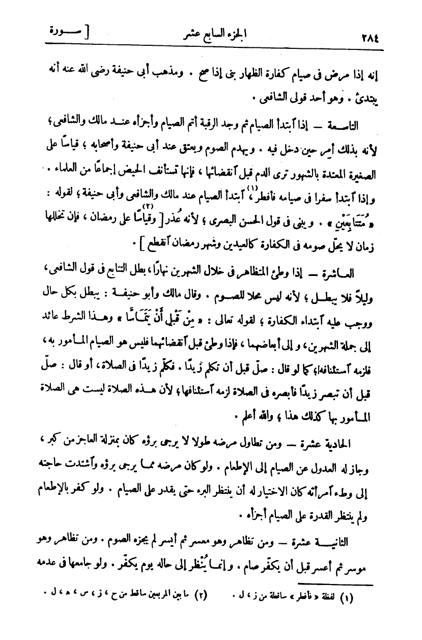 إِنَّهُ إِذَا مَرِضَ فِي صِيَامِ كَفَّارَةِ الظِّهَارِ بَنَى إِذَا صَحَّ. وَمَذْهَبُ أَبِي حَنِيفَةَ رَضِيَ اللَّهُ عَنْهُ أَنَّهُ يَبْتَدِئُ. وَهُوَ أَحَدُ قَوْلَيِ الشَّافِعِيِّ. التَّاسِعَةُ- إِذَا ابْتَدَأَ الصِّيَامَ ثُمَّ وَجَدَ الرَّقَبَةَ أَتَمَّ الصِّيَامَ وَأَجْزَأَهُ عِنْدَ مَالِكٍ وَالشَّافِعِيِّ، لِأَنَّهُ بِذَلِكَ أُمِرَ حِينَ دَخَلَ فِيهِ. وَيَهْدِمُ الصَّوْمَ وَيَعْتِقُ عِنْدَ أَبِي حَنِيفَةَ وَأَصْحَابِهِ، قِيَاسًا عَلَى الصَّغِيرَةِ الْمُعْتَدَّةِ بِالشُّهُورِ تَرَى الدَّمَ قَبْلَ انْقِضَائِهَا، فَإِنَّهَا تَسْتَأْنِفُ الْحَيْضَ إِجْمَاعًا مِنَ الْعُلَمَاءِ. وَإِذَا ابْتَدَأَ سَفَرًا فِي صِيَامِهِ فَأَفْطَرَ «١»، ابْتَدَأَ الصِّيَامَ عِنْدَ مَالِكٍ وَالشَّافِعِيِّ وَأَبِي حَنِيفَةَ، لِقَوْلِهِ: (مُتَتابِعَيْنِ). وَيَبْنِي فِي قَوْلِ الْحَسَنِ الْبَصْرِيِّ، لِأَنَّهُ عُذْرٌ [وَقِيَاسًا «٢» عَلَى رَمَضَانَ، فَإِنْ تَخَلَّلَهَا زَمَانٌ لَا يَحِلُّ صَوْمُهُ فِي الْكَفَّارَةِ كَالْعِيدَيْنِ وَشَهْرِ رَمَضَانَ انْقَطَعَ]. الْعَاشِرَةُ- إِذَا وَطِئَ الْمُتَظَاهِرُ فِي خِلَالِ الشَّهْرَيْنِ نَهَارًا، بَطَلَ التَّتَابُعُ فِي قَوْلِ الشَّافِعِيِّ، وَلَيْلًا فَلَا يَبْطُلُ، لِأَنَّهُ لَيْسَ مَحِلًّا لِلصَّوْمِ. وَقَالَ مَالِكٌ وَأَبُو حَنِيفَةَ: يَبْطُلُ بِكُلِّ حَالٍ وَوَجَبَ عَلَيْهِ ابْتِدَاءُ الْكَفَّارَةِ، لِقَوْلِهِ تَعَالَى: (مِنْ قَبْلِ أَنْ يَتَمَاسَّا) وَهَذَا الشَّرْطُ عَائِدٌ إِلَى جُمْلَةِ الشَّهْرَيْنِ، وَإِلَى أَبْعَاضِهِمَا، فَإِذَا وَطِئَ قَبْلَ انْقِضَائِهِمَا فَلَيْسَ هُوَ الصِّيَامُ الْمَأْمُورُ بِهِ، فَلَزِمَهُ اسْتِئْنَافُهُ، كَمَا لَوْ قَالَ: صَلِّ قَبْلَ أَنْ تُكَلِّمَ زَيْدًا. فَكَلَّمَ زَيْدًا فِي الصَّلَاةِ، أَوْ قَالَ: صَلِّ قَبْلَ أَنْ تُبْصِرَ زَيْدًا فَأَبْصَرَهُ فِي الصَّلَاةِ لَزِمَهُ اسْتِئْنَافُهَا، لِأَنَّ هَذِهِ الصَّلَاةَ لَيْسَتْ هِيَ الصَّلَاةُ الْمَأْمُورُ بِهَا كَذَلِكَ هَذَا، وَاللَّهُ أَعْلَمُ. الْحَادِيَةَ عَشْرَةَ- وَمَنْ تَطَاوَلَ مَرَضُهُ طُولًا لَا يُرْجَى بُرْؤُهُ كَانَ بِمَنْزِلَةِ الْعَاجِزِ مِنْ كِبَرٍ، وَجَازَ لَهُ الْعُدُولُ عَنِ الصِّيَامِ إِلَى الْإِطْعَامِ. وَلَوْ كَانَ مَرَضُهُ مِمَّا يرجى برؤه واشتدت حاجته إلى وطئ امْرَأَتِهِ كَانَ الِاخْتِيَارُ لَهُ أَنْ يَنْتَظِرَ الْبُرْءَ حَتَّى يَقْدِرَ عَلَى الصِّيَامِ. وَلَوْ كَفَّرَ بِالْإِطْعَامِ وَلَمْ يَنْتَظِرِ الْقُدْرَةَ عَلَى الصِّيَامِ أَجْزَأَهُ. الثَّانِيَةَ عَشْرَةَ- وَمَنْ تَظَاهَرَ وَهُوَ مُعْسِرٌ ثُمَّ أَيْسَرَ لَمْ يُجْزِهِ الصَّوْمُ. وَمَنْ تَظَاهَرَ وَهُوَ مُوسِرٌ ثُمَّ أَعْسَرَ قَبْلَ أَنْ يُكَفِّرَ صَامَ. وَإِنَّمَا يُنْظَرُ إِلَى حَالِهِ يَوْمَ يُكَفِّرُ. وَلَوْ جَامَعَهَا في عدمه