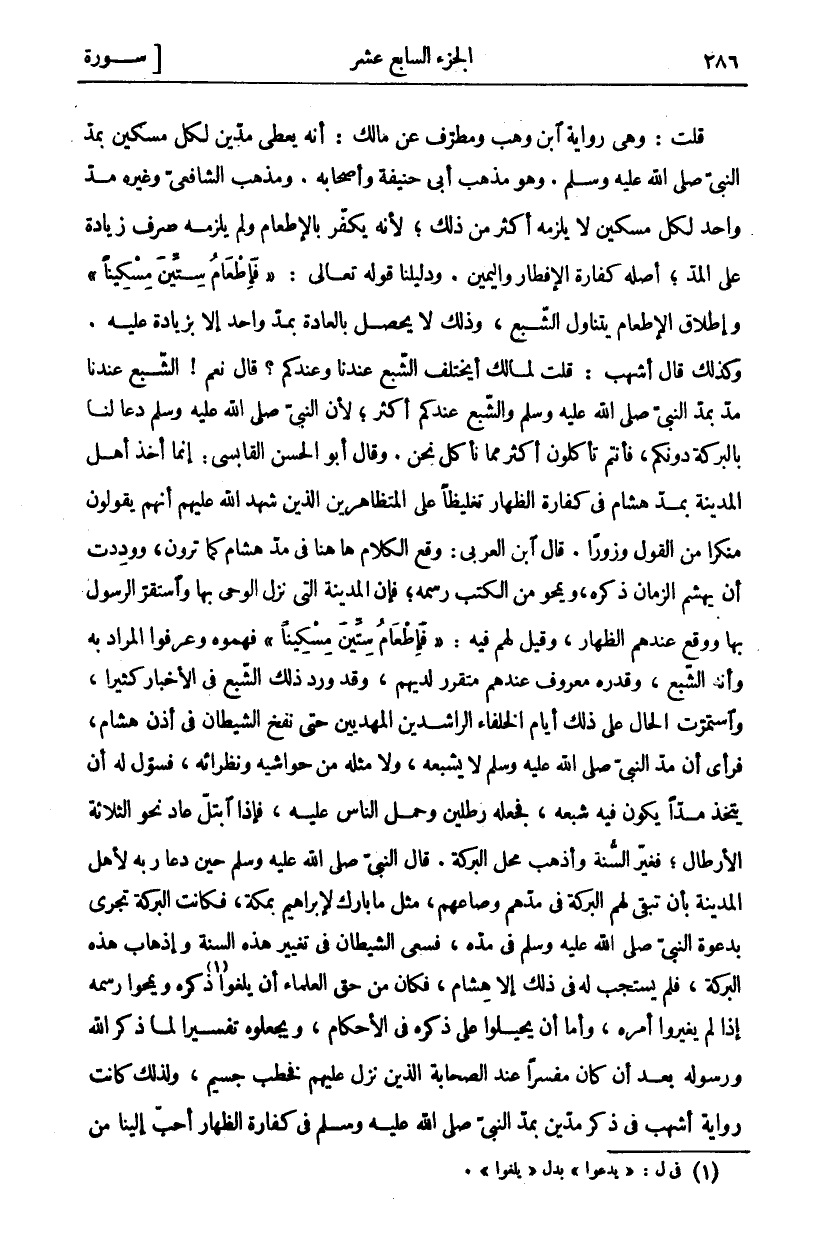 قُلْتُ: وَهِيَ رِوَايَةُ ابْنِ وَهْبٍ وَمُطَرِّفٍ عَنْ مَالِكٍ: أَنَّهُ يُعْطِي مُدَّيْنِ لِكُلِّ مِسْكِينٍ بِمُدِّ النَّبِيِّ صَلَّى اللَّهُ عَلَيْهِ وَسَلَّمَ. وَهُوَ مَذْهَبُ أَبِي حَنِيفَةَ وَأَصْحَابِهِ. وَمَذْهَبُ الشَّافِعِيِّ وَغَيْرِهِ مُدٌّ وَاحِدٌ لِكُلِّ مِسْكِينٍ لَا يَلْزَمُهُ أَكْثَرُ مِنْ ذَلِكَ، لِأَنَّهُ يُكَفِّرُ بِالْإِطْعَامِ وَلَمْ يَلْزَمْهُ صَرْفُ زِيَادَةٍ عَلَى الْمُدِّ، أَصْلُهُ كَفَّارَةُ الْإِفْطَارِ وَالْيَمِينِ. وَدَلِيلُنَا قَوْلُهُ تَعَالَى: (فَإِطْعامُ سِتِّينَ مِسْكِيناً) وَإِطْلَاقُ الْإِطْعَامِ يَتَنَاوَلُ الشِّبَعَ، وَذَلِكَ لَا يَحْصُلُ بِالْعَادَةِ بِمُدٍّ وَاحِدٍ إِلَّا بِزِيَادَةٍ عَلَيْهِ. وَكَذَلِكَ قَالَ أَشْهَبُ: قُلْتُ لِمَالِكٍ أَيَخْتَلِفُ الشِّبَعُ عِنْدَنَا وَعِنْدَكُمْ؟ قَالَ نَعَمْ! الشِّبَعُ عِنْدَنَا مُدَّ بِمُدِّ النَّبِيَّ صَلَّى اللَّهُ عَلَيْهِ وَسَلَّمَ وَالشِّبَعُ عِنْدَكُمْ أَكْثَرُ، لِأَنَّ النَّبِيَّ صَلَّى اللَّهُ عَلَيْهِ وَسَلَّمَ دَعَا لَنَا بِالْبَرَكَةِ دُونَكُمْ، فَأَنْتُمْ تَأْكُلُونَ أَكْثَرَ مِمَّا نَأْكُلُ نَحْنُ. وَقَالَ أَبُو الْحَسَنِ الْقَابِسِيُّ: إِنَّمَا أَخَذَ أَهْلُ الْمَدِينَةِ بِمُدِّ هِشَامٍ فِي كَفَّارَةِ الظِّهَارِ تَغْلِيظًا عَلَى الْمُتَظَاهِرِينَ الَّذِينَ شَهِدَ اللَّهُ عَلَيْهِمْ أَنَّهُمْ يَقُولُونَ مُنْكَرًا مِنَ الْقَوْلِ وَزُورًا. قال ابن العربي: وقع الكلام ها هنا فِي مُدِّ هِشَامٍ كَمَا تَرَوْنَ، وَوَدِدْتُ أَنْ يُهَشِّمَ الزَّمَانُ ذِكْرَهُ، وَيَمْحُوَ مِنَ الْكُتُبِ رَسْمَهُ، فَإِنَّ الْمَدِينَةَ الَّتِي نَزَلَ الْوَحْيُ بِهَا وَاسْتَقَرَّ الرَّسُولُ بِهَا وَوَقَعَ عِنْدَهُمُ الظِّهَارُ، وَقِيلَ لَهُمْ فِيهِ: (فَإِطْعامُ سِتِّينَ مِسْكِيناً) فَهِمُوهُ وَعَرَفُوا الْمُرَادَ بِهِ وَأَنَّهُ الشِّبَعُ، وَقَدْرُهُ مَعْرُوفٌ عِنْدَهُمْ مُتَقَرِّرٌ لَدَيْهِمْ، وَقَدْ وَرَدَ ذَلِكَ الشِّبَعُ فِي الْأَخْبَارِ كَثِيرًا، وَاسْتَمَرَّتِ الْحَالُ عَلَى ذَلِكَ أَيَّامَ الْخُلَفَاءِ الرَّاشِدِينَ الْمَهْدِيِّينَ حَتَّى نَفَخَ الشَّيْطَانُ فِي أُذُنِ هِشَامٍ، فَرَأَى أَنَّ مُدَّ النَّبِيِّ صَلَّى اللَّهُ عَلَيْهِ وَسَلَّمَ لَا يُشْبِعُهُ، وَلَا مِثْلَهُ مِنْ حَوَاشِيهِ وَنُظَرَائِهِ، فَسَوَّلَ لَهُ أَنْ يَتَّخِذَ مُدًّا يَكُونُ فِيهِ شِبَعُهُ، فَجَعَلَهُ رِطْلَيْنِ وَحَمَلَ النَّاسَ عَلَيْهِ، فَإِذَا ابْتَلَّ عَادَ نَحْوَ الثَّلَاثَةِ الْأَرْطَالِ، فَغَيَّرَ السُّنَّةَ وَأَذْهَبَ مَحَلَّ الْبَرَكَةَ. قَالَ النَّبِيُّ صَلَّى اللَّهُ عَلَيْهِ وَسَلَّمَ حِينَ دَعَا رَبَّهُ لِأَهْلِ الْمَدِينَةِ بِأَنْ تَبْقَى لَهُمُ الْبَرَكَةُ فِي مُدِّهِمْ وَصَاعِهِمْ، مِثْلَ مَا بَارَكَ لِإِبْرَاهِيمَ بِمَكَّةَ، فَكَانَتِ الْبَرَكَةُ تَجْرِي بِدَعْوَةِ النَّبِيِّ صَلَّى اللَّهُ عَلَيْهِ وَسَلَّمَ فِي مُدِّهِ، فَسَعَى الشَّيْطَانُ فِي تَغْيِيرِ هَذِهِ السُّنَّةِ وَإِذْهَابِ هَذِهِ الْبَرَكَةِ، فَلَمْ يَسْتَجِبْ لَهُ فِي ذَلِكَ إِلَّا هِشَامٌ، فَكَانَ من حق العلماء أن يلغوا «١» ذكره ويمحو رَسْمَهُ إِذَا لَمْ يُغَيِّرُوا أَمْرَهُ، وَأَمَّا أَنْ يُحِيلُوا عَلَى ذِكْرِهِ فِي الْأَحْكَامِ، وَيَجْعَلُوهُ تَفْسِيرًا لِمَا ذَكَرَ اللَّهُ وَرَسُولُهُ بَعْدَ أَنْ كَانَ مُفَسَّرًا عِنْدَ الصَّحَابَةِ الَّذِينَ نَزَلَ عَلَيْهِمْ فَخَطْبٌ جَسِيمٌ، وَلِذَلِكَ كَانَتْ رِوَايَةُ أَشْهَبَ فِي ذِكْرِ مُدَّيْنِ بِمُدِّ النَّبِيِّ صَلَّى اللَّهُ عَلَيْهِ وَسَلَّمَ في كفارة الظهار أحب إلينا من