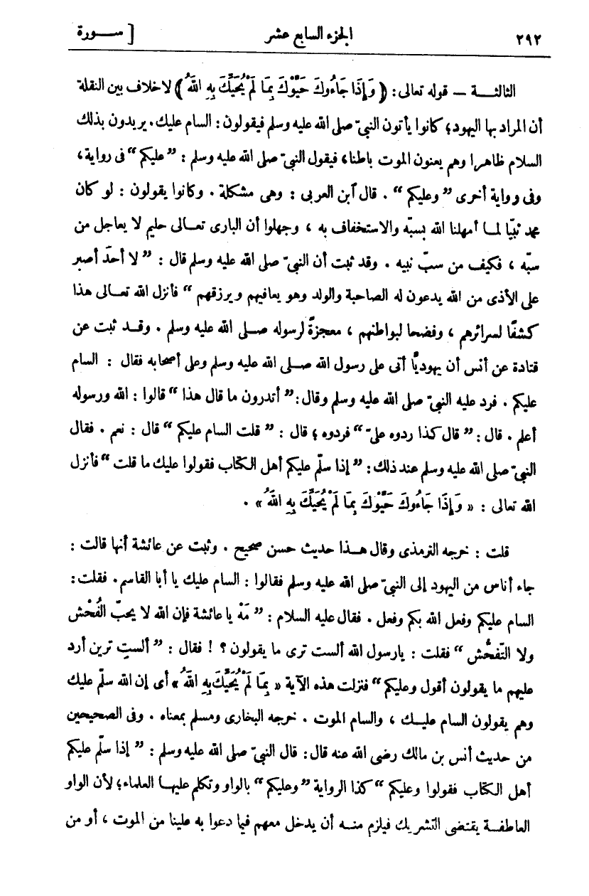 الثالثة- قوله تعالى: (وَإِذا جاؤُكَ حَيَّوْكَ بِما لَمْ يُحَيِّكَ بِهِ اللَّهُ) لَا خِلَافَ بَيْنَ النَّقَلَةِ أَنَّ الْمُرَادَ بِهَا الْيَهُودُ، كَانُوا يَأْتُونَ النَّبِيَّ صَلَّى اللَّهُ عَلَيْهِ وَسَلَّمَ فَيَقُولُونَ: السَّامُّ عَلَيْكَ. يُرِيدُونَ بِذَلِكَ السَّلَامَ ظَاهِرًا وَهُمْ يَعْنُونَ الْمَوْتَ بَاطِنًا، فَيَقُولُ النَّبِيُّ صَلَّى اللَّهُ عَلَيْهِ وَسَلَّمَ: (عَلَيْكُمْ) فِي رِوَايَةٍ، وَفِي رِوَايَةٍ أُخْرَى (وَعَلَيْكُمْ). قَالَ ابْنُ الْعَرَبِيِّ: وَهِيَ مُشْكِلَةٌ. وَكَانُوا يَقُولُونَ: لَوْ كَانَ مُحَمَّدٌ نَبِيًّا لَمَا أَمْهَلَنَا اللَّهُ بِسَبِّهِ وَالِاسْتِخْفَافِ بِهِ، وَجَهِلُوا أَنَّ الْبَارِيَ تَعَالَى حَلِيمٌ لَا يُعَاجِلُ مَنْ سَبَّهُ، فَكَيْفَ مَنْ سَبَّ نَبِيَّهُ. وَقَدْ ثَبَتَ أَنَّ النَّبِيَّ صَلَّى اللَّهُ عَلَيْهِ وَسَلَّمَ قَالَ: (لَا أَحَدَ أَصْبَرُ عَلَى الْأَذَى مِنَ اللَّهِ يَدْعُونَ لَهُ الصَّاحِبَةَ وَالْوَلَدَ وَهُوَ يُعَافِيهِمْ وَيَرْزُقُهُمْ) فَأَنْزَلَ اللَّهُ تَعَالَى هَذَا كَشْفًا لِسَرَائِرِهِمْ، وَفَضْحًا لِبَوَاطِنِهِمْ، مُعْجِزَةً لِرَسُولِهِ صَلَّى اللَّهُ عَلَيْهِ وَسَلَّمَ. وَقَدْ ثَبَتَ عَنْ قَتَادَةَ عَنْ أَنَسٍ أَنَّ يَهُودِيًّا أَتَى عَلَى رَسُولِ اللَّهِ صَلَّى اللَّهُ عَلَيْهِ وَسَلَّمَ وَعَلَى أَصْحَابِهِ فَقَالَ: السَّامُّ عَلَيْكُمْ. فَرَدَّ عَلَيْهِ النَّبِيُّ صَلَّى اللَّهُ عَلَيْهِ وَسَلَّمَ وَقَالَ: (أَتَدْرُونَ مَا قَالَ هَذَا) قَالُوا: اللَّهُ وَرَسُولُهُ أَعْلَمُ. قَالَ: (قَالَ كَذَا رُدُّوهُ عَلَيَّ) فَرَدُّوهُ، قَالَ: (قُلْتَ السَّامُّ عَلَيْكُمْ) قَالَ: نَعَمْ. فَقَالَ النَّبِيُّ صَلَّى اللَّهُ عَلَيْهِ وَسَلَّمَ عِنْدَ ذَلِكَ: (إِذَا سَلَّمَ عَلَيْكُمْ أَهْلُ الْكِتَابِ فَقُولُوا عَلَيْكَ مَا قُلْتَ) فَأَنْزَلَ اللَّهُ تَعَالَى: (وَإِذا جاؤُكَ حَيَّوْكَ بِما لَمْ يُحَيِّكَ بِهِ اللَّهُ). قُلْتُ: خَرَّجَهُ التِّرْمِذِيُّ وَقَالَ هَذَا حَدِيثٌ حَسَنٌ صَحِيحٌ. وَثَبَتَ عَنْ عَائِشَةَ أَنَّهَا قَالَتْ: جَاءَ أُنَاسٌ مِنَ الْيَهُودِ إِلَى النَّبِيِّ صَلَّى اللَّهُ عَلَيْهِ وَسَلَّمَ فَقَالُوا: السَّامُّ عَلَيْكَ يَا أَبَا الْقَاسِمِ. فَقُلْتُ: السَّامُّ عَلَيْكُمْ وَفَعَلَ اللَّهُ بِكُمْ وَفَعَلَ. فَقَالَ عَلَيْهِ السَّلَامُ: (مَهْ يَا عَائِشَةُ فَإِنَّ اللَّهَ لَا يُحِبُّ الْفُحْشَ وَلَا التَّفَحُّشَ) فَقُلْتُ: يَا رَسُولَ اللَّهِ أَلَسْتَ تَرَى مَا يَقُولُونَ؟! فَقَالَ: (أَلَسْتِ تَرَيْنَ أَرُدُّ عَلَيْهِمْ مَا يَقُولُونَ أَقُولُ وَعَلَيْكُمْ) فَنَزَلَتْ هَذِهِ الْآيَةُ (بِما لَمْ يُحَيِّكَ بِهِ اللَّهُ) أَيْ إِنَّ اللَّهَ سَلَّمَ عَلَيْكَ وَهُمْ يَقُولُونَ السَّامُّ عَلَيْكَ، وَالسَّامُّ الْمَوْتُ. خَرَّجَهُ الْبُخَارِيُّ وَمُسْلِمٌ بِمَعْنَاهُ. وَفِي الصَّحِيحَيْنِ مِنْ حَدِيثِ أَنَسِ بْنِ مَالِكٍ رَضِيَ اللَّهُ عَنْهُ قَالَ: قَالَ النَّبِيُّ صَلَّى اللَّهُ عَلَيْهِ وَسَلَّمَ: (إِذَا سَلَّمَ عَلَيْكُمْ أَهْلُ الْكِتَابِ فَقُولُوا وَعَلَيْكُمْ) كَذَا الرِّوَايَةُ (وَعَلَيْكُمْ) بِالْوَاوِ تَكَلَّمَ عَلَيْهَا الْعُلَمَاءُ، لِأَنَّ الْوَاوَ الْعَاطِفَةَ يَقْتَضِي التَّشْرِيكَ فَيَلْزَمُ مِنْهُ أَنْ يَدْخُلَ مَعَهُمْ فِيمَا دَعَوْا بِهِ عَلَيْنَا مِنَ الْمَوْتِ، أَوْ مِنْ