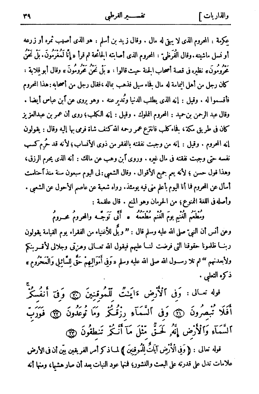 عِكْرِمَةُ: الْمَحْرُومُ الَّذِي لَا يَبْقَى لَهُ مَالٌ. وَقَالَ زَيْدُ بْنُ أَسْلَمَ: هُوَ الَّذِي أُصِيبَ ثَمَرُهُ أَوْ زَرْعُهُ أَوْ نَسْلُ مَاشِيَتِهِ. وَقَالَ الْقُرَظِيُّ: الْمَحْرُومُ الَّذِي أَصَابَتْهُ الْجَائِحَةُ ثُمَّ قَرَأَ (إن لَمُغْرَمُونَ. بَلْ نَحْنُ مَحْرُومُونَ) نَظِيرُهُ فِي قِصَّةِ أَصْحَابِ الْجَنَّةِ حَيْثُ قَالُوا: (بَلْ نَحْنُ مَحْرُومُونَ) وَقَالَ أَبُو قِلَابَةَ: كَانَ رَجُلٌ مِنْ أَهْلِ الْيَمَامَةِ لَهُ مَالٌ فَجَاءَ سَيْلٌ فَذَهَبَ بِمَالِهِ، فَقَالَ رَجُلٌ مِنْ أَصْحَابِهِ: هَذَا الْمَحْرُومُ فَاقْسِمُوا لَهُ. وَقِيلَ: إِنَّهُ الَّذِي يَطْلُبُ الدُّنْيَا وَتُدْبِرُ عَنْهُ. وَهُوَ يُرْوَى عَنِ ابْنِ عَبَّاسٍ أَيْضًا. وَقَالَ عَبْدُ الرَّحْمَنِ بْنُ حُمَيْدٍ: الْمَحْرُومُ الْمَمْلُوكُ. وَقِيلَ: إِنَّهُ الْكَلْبُ، رُوِيَ أَنَّ عُمَرَ بْنَ عَبْدِ الْعَزِيزِ كَانَ فِي طَرِيقِ مَكَّةَ، فَجَاءَ كَلْبٌ فَانْتَزَعَ عُمَرُ رَحِمَهُ اللَّهُ كَتِفَ شَاةٍ فَرَمَى بِهَا إِلَيْهِ وَقَالَ: يَقُولُونَ إِنَّهُ الْمَحْرُومُ. وَقِيلَ: إِنَّهُ مَنْ وَجَبَتْ نَفَقَتُهُ بِالْفَقْرِ مِنْ ذَوِي الْأَنْسَابِ، لِأَنَّهُ قَدْ حُرِمَ كَسْبَ نَفْسِهِ حَتَّى وَجَبَتْ نَفَقَتُهُ فِي مَالِ غَيْرِهِ. وَرَوَى ابْنُ وَهْبٍ عَنْ مَالِكٍ: أَنَّهُ الَّذِي يُحْرَمُ الرِّزْقَ، وَهَذَا قَوْلٌ حَسَنٌ، لِأَنَّهُ يَعُمُّ جَمِيعَ الْأَقْوَالِ. وَقَالَ الشَّعْبِيُّ: لِيَ الْيَوْمَ سَبْعُونَ سَنَةً مُنْذُ احْتَلَمْتُ أَسْأَلُ عَنِ الْمَحْرُومِ فَمَا أَنَا الْيَوْمَ بِأَعْلَمَ مِنِّي فِيهِ يَوْمَئِذٍ. رَوَاهُ شُعْبَةُ عَنْ عَاصِمٍ الْأَحْوَلِ عَنِ الشَّعْبِيِّ. وَأَصْلُهُ فِي اللُّغَةِ الْمَمْنُوعُ، مِنَ الْحِرْمَانِ وَهُوَ الْمَنْعُ. قَالَ عَلْقَمَةُ: