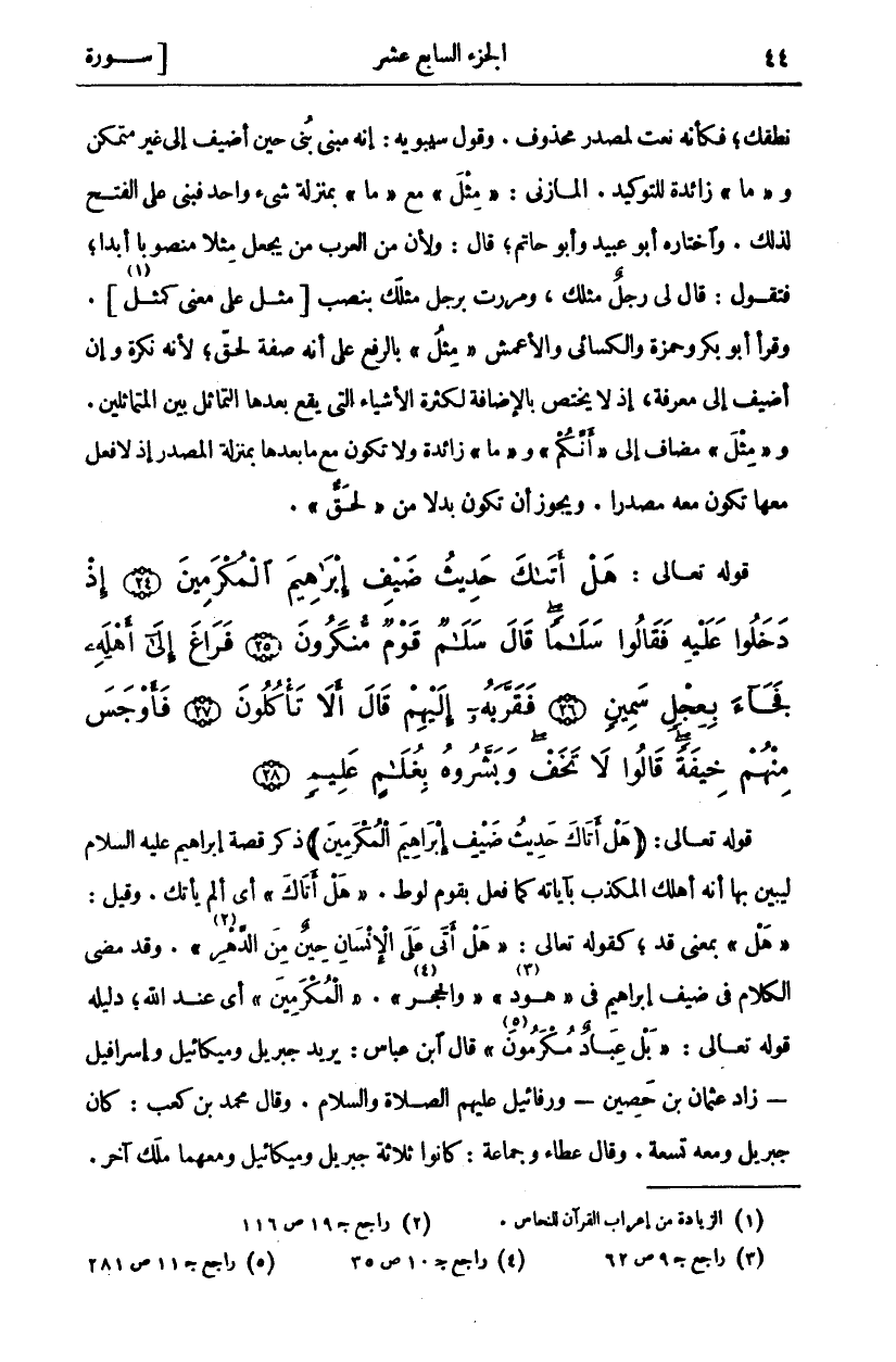 قوله تعالى: (هَلْ أَتاكَ حَدِيثُ ضَيْفِ إِبْراهِيمَ الْمُكْرَمِينَ) ذَكَرَ قِصَّةَ إِبْرَاهِيمَ عَلَيْهِ السَّلَامُ لِيُبَيِّنَ بِهَا أَنَّهُ أَهْلَكَ الْمُكَذِّبَ بِآيَاتِهِ كَمَا فَعَلَ بِقَوْمِ لُوطٍ. (هَلْ أَتاكَ) أَيْ أَلَمْ يَأْتِكَ. وَقِيلَ: (هَلْ) بِمَعْنَى قَدْ، كَقَوْلِهِ تَعَالَى: (هَلْ أَتى عَلَى الْإِنْسانِ حِينٌ مِنَ الدَّهْرِ) «٢». وَقَدْ مَضَى الْكَلَامُ فِي ضَيْفِ إِبْرَاهِيمَ فِي (هُودٍ) «٣» (والحجر) «٤». (الْمُكْرَمِينَ) أَيْ عِنْدَ اللَّهِ، دَلِيلُهُ قَوْلُهُ تَعَالَى: (بَلْ عِبادٌ مُكْرَمُونَ) «٥» قَالَ ابْنُ عَبَّاسٍ: يُرِيدُ جِبْرِيلَ وَمِيكَائِيلَ وَإِسْرَافِيلَ- زَادَ عُثْمَانُ بْنُ حُصَيْنٍ- وَرَفَائِيلَ عَلَيْهِمُ الصَّلَاةُ وَالسَّلَامُ. وَقَالَ مُحَمَّدُ بْنُ كَعْبٍ: كَانَ جِبْرِيلُ وَمَعَهُ تِسْعَةٌ. وَقَالَ عَطَاءٌ وَجَمَاعَةٌ: كَانُوا ثَلَاثَةً جِبْرِيلُ وَمِيكَائِيلُ وَمَعَهُمَا مَلَكٌ آخر.