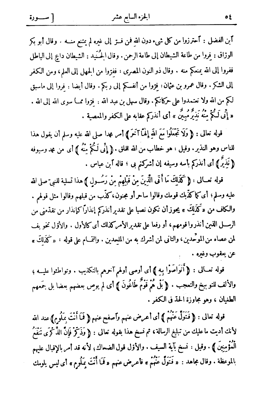 ابن الفضل: احترزوا من كل شي دُونَ اللَّهِ فَمَنْ فَرَّ إِلَى غَيْرِهِ لَمْ يَمْتَنِعْ مِنْهُ. وَقَالَ أَبُو بَكْرٍ الْوَرَّاقُ: فِرُّوا مِنْ طَاعَةِ الشَّيْطَانِ إِلَى طَاعَةِ الرَّحْمَنِ. وَقَالَ الْجُنَيْدُ: الشَّيْطَانُ دَاعٍ إِلَى الْبَاطِلِ فَفِرُّوا إِلَى اللَّهِ يَمْنَعُكُمْ مِنْهُ. وَقَالَ ذُو النُّونِ الْمِصْرِيُّ: فَفِرُّوا مِنَ الْجَهْلِ إِلَى الْعِلْمِ، وَمِنَ الْكُفْرِ إِلَى الشُّكْرِ. وَقَالَ عَمْرُو بْنُ عُثْمَانَ: فِرُّوا مِنْ أَنْفُسِكُمْ إِلَى رَبِّكُمْ. وَقَالَ أَيْضًا: فِرُّوا إِلَى مَا سَبَقَ لَكُمْ مِنَ اللَّهِ وَلَا تَعْتَمِدُوا عَلَى حَرَكَاتِكُمْ. وَقَالَ سَهْلُ بْنُ عَبْدِ اللَّهِ: فِرُّوا مِمَّا سِوَى اللَّهِ إِلَى اللَّهِ. (إِنِّي لَكُمْ مِنْهُ نَذِيرٌ مُبِينٌ) أَيْ أُنْذِرُكُمْ عقابه على الكفر والمعصية. قوله تعالى: (وَلا تَجْعَلُوا مَعَ اللَّهِ إِلهاً آخَرَ) أَمَرَ مُحَمَّدًا صَلَّى اللَّهُ عَلَيْهِ وَسَلَّمَ أَنْ يَقُولَ هَذَا لِلنَّاسِ وَهُوَ النَّذِيرُ. وَقِيلَ: هُوَ خِطَابٌ مِنَ اللَّهِ لِلْخَلْقِ. (إِنِّي لَكُمْ مِنْهُ) أَيْ مِنْ مُحَمَّدٍ وَسُيُوفِهِ (نَذِيرٌ) أَيْ أُنْذِرُكُمْ بَأْسَهُ وَسَيْفَهُ إِنْ أَشْرَكْتُمْ بِي، قَالَهُ ابْنُ عَبَّاسٍ. قَوْلُهُ تَعَالِى: (كَذلِكَ مَا أَتَى الَّذِينَ مِنْ قَبْلِهِمْ مِنْ رَسُولٍ) هَذَا تَسْلِيَةٌ لِلنَّبِيِّ صَلَّى اللَّهُ عَلَيْهِ وَسَلَّمَ، أَيْ كَمَا كَذَّبَكَ قَوْمُكَ وَقَالُوا سَاحِرٌ أَوْ مَجْنُونٌ، كَذَّبَ مَنْ قَبْلَهُمْ وَقَالُوا مِثْلَ قَوْلِهِمْ. وَالْكَافُ مِنْ (كَذلِكَ) يَجُوزُ أَنْ تَكُونَ نَصْبًا عَلَى تَقْدِيرِ أُنْذِرُكُمْ إِنْذَارًا كَإِنْذَارِ مَنْ تَقَدَّمَنِي مِنَ الرُّسُلِ الَّذِينَ أَنْذَرُوا قَوْمَهُمْ، أَوْ رَفْعًا عَلَى تَقْدِيرِ الْأَمْرُ كَذَلِكَ أَيْ كَالْأَوَّلِ. وَالْأَوَّلُ تَخْوِيفٌ لِمَنْ عَصَاهُ مِنَ الْمُوَحِّدِينَ، وَالثَّانِي لِمَنْ أَشْرَكَ بِهِ مِنَ الْمُلْحِدِينَ. وَالتَّمَامُ عَلَى قَوْلِهِ: (كَذلِكَ) عَنْ يَعْقُوبَ وَغَيْرِهِ. قَوْلُهُ تَعَالَى: (أَتَواصَوْا بِهِ) أَيْ أَوْصَى أَوَّلُهُمْ آخِرَهُمْ بِالتَّكْذِيبِ. وَتَوَاطَئُوا عَلَيْهِ، وَالْأَلِفُ لِلتَّوْبِيخِ وَالتَّعَجُّبِ. (بَلْ هُمْ قَوْمٌ طاغُونَ) أَيْ لَمْ يُوصِ بَعْضُهُمْ بَعْضًا بَلْ جَمَعَهُمُ الطُّغْيَانُ، وَهُوَ مُجَاوَزَةُ الْحَدِّ فِي الْكُفْرِ. قَوْلُهُ تَعَالَى: (فَتَوَلَّ عَنْهُمْ) أَيْ أَعْرِضْ عَنْهُمْ وَاصْفَحْ عَنْهُمْ (فَما أَنْتَ بِمَلُومٍ) عِنْدَ اللَّهِ لِأَنَّكَ أَدَّيْتَ مَا عَلَيْكَ مِنْ تَبْلِيغِ الرِّسَالَةِ، ثُمَّ نُسِخَ هَذَا بِقَوْلِهِ تَعَالَى: (وَذَكِّرْ فَإِنَّ الذِّكْرى تَنْفَعُ الْمُؤْمِنِينَ) وَقِيلَ: نُسِخَ بِآيَةِ السَّيْفِ. وَالْأَوَّلُ قَوْلُ الضَّحَّاكِ، لِأَنَّهُ قَدْ أُمِرَ بِالْإِقْبَالِ عَلَيْهِمْ بِالْمَوْعِظَةِ. وَقَالَ مُجَاهِدٌ: (فَتَوَلَّ عَنْهُمْ) فَأَعْرِضْ عَنْهُمْ (فَما أَنْتَ بِمَلُومٍ) أَيْ لَيْسَ يَلُومُكَ