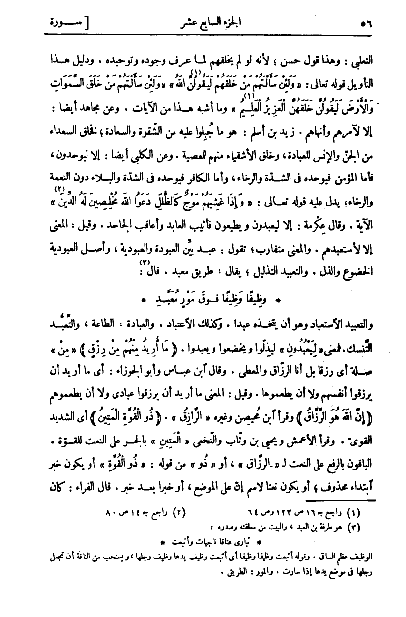 وَالتَّعْبِيدُ الِاسْتِعْبَادُ وَهُوَ أَنْ يَتَّخِذَهُ عَبْدًا. وَكَذَلِكَ الِاعْتِبَادُ. وَالْعِبَادَةُ: الطَّاعَةُ، وَالتَّعَبُّدُ التَّنَسُّكُ. فَمَعْنَى (لِيَعْبُدُونِ) لِيَذِلُّوا وَيَخْضَعُوا وَيَعْبُدُوا. (مَا أُرِيدُ مِنْهُمْ مِنْ رِزْقٍ) (مِنْ) صِلَةٌ أَيْ رِزْقًا بَلْ أَنَا الرَّزَّاقُ وَالْمُعْطِي. وَقَالَ ابْنُ عَبَّاسٍ وَأَبُو الْجَوْزَاءِ: أَيْ مَا أُرِيدُ أَنْ يَرْزُقُوا أَنْفُسَهُمْ وَلَا أَنْ يُطْعِمُوهَا. وَقِيلَ: الْمَعْنَى مَا أُرِيدُ أَنْ يَرْزُقُوا عِبَادِيَ وَلَا أَنْ يُطْعِمُوهُمْ (إِنَّ اللَّهَ هُوَ الرَّزَّاقُ) وَقَرَأَ ابْنُ مُحَيْصِنٍ وَغَيْرُهُ (الرَّازِقُ). (ذُو الْقُوَّةِ الْمَتِينُ) أَيِ الشَّدِيدُ الْقَوِيُّ. وَقَرَأَ الْأَعْمَشُ وَيَحْيَى بْنُ وَثَّابٍ وَالنَّخَعِيُّ (الْمَتِينُ) بِالْجَرِّ عَلَى النَّعْتِ لِلْقُوَّةِ. الْبَاقُونَ بِالرَّفْعِ عَلَى النَّعْتِ لِ (الرَّزَّاقُ) أَوْ (ذُو) مِنْ قَوْلِهِ: (ذُو الْقُوَّةِ) أَوْ يَكُونُ خَبَرَ ابْتِدَاءٍ مَحْذُوفٍ، أَوْ يَكُونُ نَعْتًا لِاسْمِ إِنَّ عَلَى الْمَوْضِعِ، أَوْ خَبَرًا بَعْدَ خبر. قال الفراء: كان