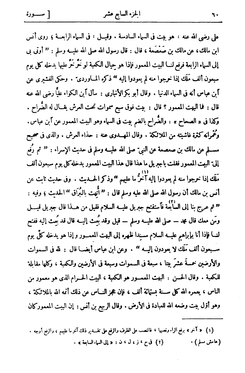 عَلِيٌّ رَضِيَ اللَّهُ عَنْهُ: هُوَ بَيْتٌ فِي السَّمَاءِ السَّادِسَةِ. وَقِيلَ: فِي السَّمَاءِ الرَّابِعَةِ، رَوَى أنس ابن مَالِكٍ، عَنْ مَالِكِ بْنِ صَعْصَعَةَ، قَالَ: قَالَ رَسُولُ اللَّهِ صَلَّى اللَّهُ عَلَيْهِ وَسَلَّمَ: (أُوتِيَ بِي إِلَى السَّمَاءِ الرَّابِعَةِ فَرُفِعَ لَنَا الْبَيْتُ الْمَعْمُورُ فَإِذَا هُوَ حِيَالُ الْكَعْبَةِ لَوْ خَرَّ خَرَّ عَلَيْهَا يَدْخُلُهُ كُلَّ يَوْمٍ سَبْعُونَ أَلْفَ مَلَكٍ إِذَا خَرَجُوا مِنْهُ لَمْ يَعُودُوا إِلَيْهِ) ذَكَرَهُ الْمَاوَرْدِيُّ. وَحَكَى الْقُشَيْرِيُّ عَنِ ابْنِ عَبَّاسٍ أَنَّهُ فِي السَّمَاءِ الدُّنْيَا. وَقَالَ أَبُو بَكْرٍ الْأَنْبَارِيُّ: سَأَلَ ابْنُ الْكَوَّاءِ عَلِيًّا رَضِيَ اللَّهُ عَنْهُ قَالَ: فَمَا الْبَيْتُ الْمَعْمُورُ؟ قَالَ: بَيْتٌ فَوْقَ سَبْعِ سَمَوَاتٍ تَحْتَ الْعَرْشِ يُقَالُ لَهُ الضُّرَاحُ. وَكَذَا فِي (الصِّحَاحِ): وَالضُّرَاحُ بِالضَّمِّ بَيْتٌ فِي السَّمَاءِ وَهُوَ الْبَيْتُ الْمَعْمُورُ عَنِ ابْنِ عباس. وعمر أنه كَثْرَةُ غَاشِيَتِهِ مِنَ الْمَلَائِكَةِ. وَقَالَ الْمَهْدَوِيُّ عَنْهُ: حِذَاءَ الْعَرْشِ. وَالَّذِي فِي صَحِيحِ مُسْلِمٍ عَنْ مَالِكِ بْنِ صَعْصَعَةَ عَنِ النَّبِيِّ صَلَّى اللَّهُ عَلَيْهِ وَسَلَّمَ فِي حَدِيثِ الْإِسْرَاءِ: (ثُمَّ رُفِعَ إِلَى الْبَيْتِ الْمَعْمُورِ فَقُلْتُ يَا جِبْرِيلُ مَا هَذَا قَالَ هَذَا الْبَيْتُ الْمَعْمُورُ يَدْخُلُهُ كُلَّ يوم سبعون ألف ملك إذ اخرجوا مِنْهُ لَمْ يَعُودُوا إِلَيْهِ آخِرَ «١» مَا عَلَيْهِمْ) وَذَكَرَ الْحَدِيثَ. وَفِي حَدِيثِ ثَابِتٍ عَنْ أَنَسِ بْنِ مَالِكٍ أَنَّ رَسُولَ اللَّهِ صَلَّى اللَّهُ عَلَيْهِ وَسَلَّمَ قَالَ: (أُتِيَتُ بِالْبُرَاقِ) الْحَدِيثَ، وَفِيهِ: (ثُمَّ عُرِجَ بِنَا إِلَى السَّابِعَةِ) «٢» (فَاسْتَفْتَحَ جِبْرِيلُ عَلَيْهِ السَّلَامُ فَقِيلَ مَنْ هَذَا قَالَ جِبْرِيلُ قِيلَ وَمَنْ مَعَكَ قَالَ مُحَمَّدٌ- صَلَّى اللَّهُ عَلَيْهِ وَسَلَّمَ- قِيلَ وَقَدْ بُعِثَ إِلَيْهِ قَالَ قَدْ بُعِثَ إِلَيْهِ فَفُتِحَ لَنَا فَإِذَا أَنَا بِإِبْرَاهِيمَ عَلَيْهِ السَّلَامُ مُسْنِدًا ظَهْرَهُ إِلَى الْبَيْتِ الْمَعْمُورِ وَإِذَا هُوَ يَدْخُلُهُ كُلَّ يَوْمٍ سَبْعُونَ أَلْفَ مَلَكٍ لَا يَعُودُونَ إِلَيْهِ (. وَعَنِ ابْنِ عباس أيضا قال: لله في السموات والأرضين خمسة عشر بيتا، سبعة في السموات وَسَبْعَةٌ فِي الْأَرَضِينَ وَالْكَعْبَةُ، وَكُلُّهَا مُقَابِلَةٌ لِلْكَعْبَةِ. وَقَالَ الْحَسَنُ: الْبَيْتِ الْمَعْمُورِ هُوَ الْكَعْبَةُ، الْبَيْتُ الْحَرَامُ الَّذِي هُوَ مَعْمُورٌ مِنَ النَّاسِ، يَعْمُرُهُ اللَّهُ كُلَّ سَنَةٍ بِسِتِّمِائَةِ أَلْفٍ، فَإِنْ عَجَزَ النَّاسُ عَنْ ذَلِكَ أَتَمَّهُ اللَّهُ بِالْمَلَائِكَةِ، وَهُوَ أَوَّلُ بَيْتٍ وَضَعَهُ اللَّهُ لِلْعِبَادَةِ فِي الْأَرْضِ. وَقَالَ الرَّبِيعُ بْنُ أَنَسٍ: إِنَّ الْبَيْتَ الْمَعْمُورَ كان