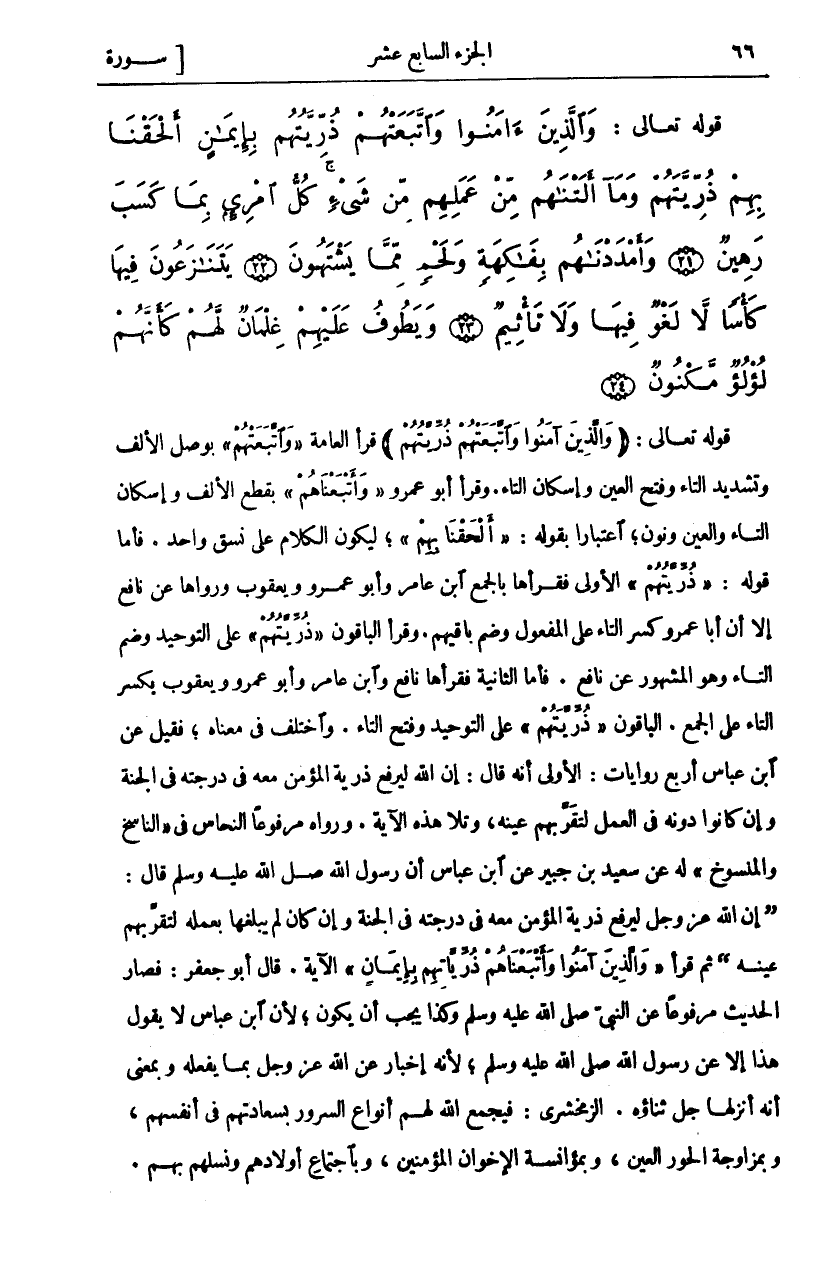 قَوْلُهُ تَعَالَى: (وَالَّذِينَ آمَنُوا وَاتَّبَعَتْهُمْ ذُرِّيَّتُهُمْ) قَرَأَ الْعَامَّةُ (وَاتَّبَعَتْهُمْ) بِوَصْلِ الْأَلِفِ وَتَشْدِيدِ التاء وفتح العين وإسكان التاء. وقرا عَمْرٍو (وَأَتْبَعْنَاهُمْ) بِقَطْعِ الْأَلِفِ وَإِسْكَانِ التَّاءِ وَالْعَيْنِ وَنُونٍ، اعْتِبَارًا بِقَوْلِهِ: (أَلْحَقْنا بِهِمْ)، لِيَكُونَ الْكَلَامُ عَلَى نَسَقٍ وَاحِدٍ. فَأَمَّا قَوْلُهُ: (ذُرِّيَّتُهُمْ) الْأُولَى فَقَرَأَهَا بِالْجَمْعِ ابْنُ عَامِرٍ وَأَبُو عَمْرٍو وَيَعْقُوبُ وَرَوَاهَا عَنْ نَافِعٍ إِلَّا أَنَّ أَبَا عَمْرٍو كَسَرَ التَّاءَ عَلَى الْمَفْعُولِ وَضَمَّ بَاقِيهِمْ. وَقَرَأَ الْبَاقُونَ (ذُرِّيَّتُهُمْ) عَلَى التَّوْحِيدِ وَضَمِّ التَّاءِ وَهُوَ الْمَشْهُورُ عَنْ نَافِعٍ. فَأَمَّا الثَّانِيَةُ فَقَرَأَهَا نَافِعٌ وَابْنُ عَامِرٍ وَأَبُو عَمْرٍو وَيَعْقُوبُ بِكَسْرِ التَّاءِ عَلَى الْجَمْعِ. الْبَاقُونَ (ذُرِّيَّتَهُمْ) عَلَى التَّوْحِيدِ وَفَتْحِ التَّاءِ. وَاخْتُلِفَ فِي مَعْنَاهُ، فَقِيلَ عَنِ ابْنِ عَبَّاسٍ أَرْبَعُ رِوَايَاتٍ: الْأُولَى أَنَّهُ قَالَ: إِنَّ اللَّهَ لَيَرْفَعُ ذُرِّيَّةَ الْمُؤْمِنِ مَعَهُ فِي دَرَجَتِهِ فِي الْجَنَّةِ وَإِنْ كَانُوا دُونَهُ فِي الْعَمَلِ لِتَقَرَّ بِهِمْ عَيْنُهُ، وَتَلَا هَذِهِ الْآيَةَ. وَرَوَاهُ مَرْفُوعًا النَّحَّاسُ فِي (النَّاسِخِ وَالْمَنْسُوخِ) لَهُ عَنْ سَعِيدِ بْنِ جُبَيْرٍ عَنِ ابْنِ عَبَّاسٍ أَنَّ رسول الله صَلَّى اللَّهُ عَلَيْهِ وَسَلَّمَ قال: (إِنَّ اللَّهَ عَزَّ وَجَلَّ لَيَرْفَعُ ذُرِّيَّةَ الْمُؤْمِنِ مَعَهُ فِي دَرَجَتِهِ فِي الْجَنَّةِ وَإِنْ كَانَ لَمْ يَبْلُغْهَا بِعَمَلِهِ لِتَقَرَّ بِهِمْ عَيْنُهُ) ثُمَّ قَرَأَ (وَالَّذِينَ آمَنُوا وَاتَّبَعَتْهُمْ ذُرِّيَّتُهُمْ بِإِيمانٍ) الْآيَةَ. قَالَ أَبُو جَعْفَرٍ: فَصَارَ الْحَدِيثُ مَرْفُوعًا عَنِ النَّبِيِّ صَلَّى اللَّهُ عَلَيْهِ وَسَلَّمَ وَكَذَا يَجِبُ أَنْ يَكُونَ، لِأَنَّ ابْنَ عَبَّاسٍ لَا يَقُولُ هَذَا إِلَّا عَنْ رَسُولِ اللَّهِ صَلَّى اللَّهُ عَلَيْهِ وَسَلَّمَ، لِأَنَّهُ إِخْبَارٌ عَنِ اللَّهِ عَزَّ وَجَلَّ بِمَا يَفْعَلُهُ وَبِمَعْنَى أَنَّهُ أَنْزَلَهَا جَلَّ ثَنَاؤُهُ. الزَّمَخْشَرِيُّ: فَيَجْمَعُ اللَّهُ لَهُمْ أَنْوَاعَ السُّرُورِ بِسَعَادَتِهِمْ فِي أَنْفُسِهِمْ، وَبِمُزَاوَجَةِ الْحُورِ الْعِينِ، وَبِمُؤَانَسَةِ الْإِخْوَانِ الْمُؤْمِنِينَ، وَبِاجْتِمَاعِ أَوْلَادِهِمْ وَنَسْلِهِمْ بِهِمْ.