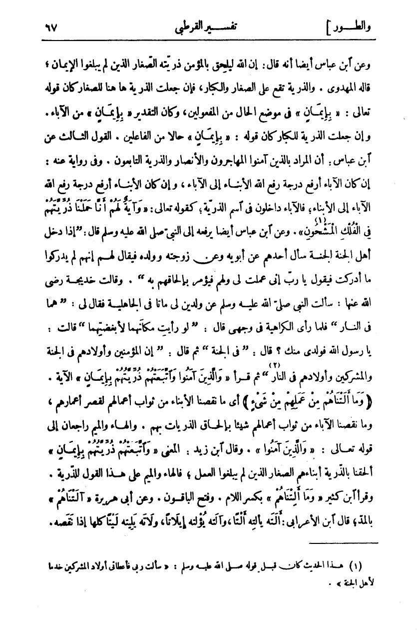 وَعَنِ ابْنِ عَبَّاسٍ أَيْضًا أَنَّهُ قَالَ: إِنَّ اللَّهَ لَيُلْحِقُ بِالْمُؤْمِنِ ذُرِّيَّتَهُ الصِّغَارَ الَّذِينَ لَمْ يبلغوا الايمان، قاله الْمَهْدَوِيُّ. وَالذُّرِّيَّةُ تَقَعُ عَلَى الصِّغَارِ وَالْكِبَارِ، فَإِنْ جعلت الذرية ها هنا لِلصِّغَارِ كَانَ قَوْلُهُ تَعَالَى: (بِإِيمانٍ) فِي مَوْضِعِ الْحَالِ مِنَ الْمَفْعُولِينَ، وَكَانَ التَّقْدِيرُ (بِإِيمانٍ) مِنَ الْآبَاءِ. وَإِنْ جُعِلَتِ الذُّرِّيَّةُ لِلْكِبَارِ كَانَ قَوْلُهُ: (بِإِيمانٍ) حَالًا مِنَ الْفَاعِلِينَ. الْقَوْلُ الثَّالِثُ عَنِ ابْنِ عَبَّاسٍ: أَنَّ الْمُرَادَ بِالَّذِينَ آمَنُوا الْمُهَاجِرُونَ وَالْأَنْصَارُ وَالذُّرِّيَّةُ التَّابِعُونَ. وَفِي رِوَايَةٍ عَنْهُ: إِنْ كَانَ الْآبَاءُ أَرْفَعَ دَرَجَةً رَفَعَ اللَّهُ الْأَبْنَاءَ إِلَى الْآبَاءِ، وَإِنْ كَانَ الْأَبْنَاءُ أَرْفَعَ دَرَجَةً رَفَعَ اللَّهُ الْآبَاءَ إِلَى الْأَبْنَاءِ، فَالْآبَاءُ دَاخِلُونَ فِي اسْمِ الذُّرِّيَّةِ، كَقَوْلِهِ تَعَالَى: (وَآيَةٌ لَهُمْ أَنَّا حَمَلْنا ذُرِّيَّتَهُمْ فِي الْفُلْكِ الْمَشْحُونِ). وَعَنِ ابْنِ عَبَّاسٍ أَيْضًا يَرْفَعْهُ إِلَى النَّبِيِّ صَلَّى اللَّهُ عَلَيْهِ وَسَلَّمَ قَالَ: (إِذَا دَخَلَ أَهْلُ الْجَنَّةِ الْجَنَّةَ سَأَلَ أَحَدُهُمْ عَنْ أَبَوَيْهِ وَعَنْ زَوْجَتِهِ وَوَلَدِهِ فَيُقَالُ لَهُمْ إِنَّهُمْ لَمْ يُدْرِكُوا مَا أَدْرَكْتَ فَيَقُولُ يَا رَبِّ إِنِّي عَمِلْتُ لِي وَلَهُمْ فَيُؤْمَرُ بِإِلْحَاقِهِمْ بِهِ. (وَقَالَتْ خَدِيجَةُ رَضِيَ اللَّهُ عَنْهَا: سَأَلْتُ النَّبِيَّ صَلَّى اللَّهُ عَلَيْهِ وَسَلَّمَ عَنْ وَلَدَيْنِ لِي مَاتَا فِي الْجَاهِلِيَّةِ فَقَالَ لِي:) هُمَا فِي النَّارِ) فَلَمَّا رَأَى الْكَرَاهِيَةَ فِي وَجْهِي قَالَ: (لَوْ رَأَيْتِ مَكَانَهُمَا لَأَبْغَضْتِهِمَا) قَالَتْ: يَا رَسُولَ اللَّهِ فَوَلَدِي مِنْكَ؟ قَالَ: (فِي الْجَنَّةِ) ثُمَّ قَالَ: (إِنَّ الْمُؤْمِنِينَ وَأَوْلَادَهُمْ فِي الْجَنَّةِ وَالْمُشْرِكِينَ وَأَوْلَادَهُمْ فِي النَّارِ) «١» ثُمَّ قَرَأَ (وَالَّذِينَ آمَنُوا وَاتَّبَعَتْهُمْ ذُرِّيَّتُهُمْ بِإِيمانٍ) الْآيَةَ. (وَما أَلَتْناهُمْ مِنْ عَمَلِهِمْ مِنْ شَيْءٍ) أَيْ مَا نَقَصْنَا الْأَبْنَاءَ مِنْ ثَوَابِ أَعْمَالِهِمْ لِقِصَرِ أَعْمَارِهِمْ، وَمَا نَقَصْنَا الْآبَاءَ مِنْ ثَوَابِ أَعْمَالِهِمْ شَيْئًا بِإِلْحَاقِ الذُّرِّيَّاتِ بِهِمْ. وَالْهَاءُ وَالْمِيمُ رَاجِعَانِ إِلَى قَوْلِهِ تَعَالَى: (وَالَّذِينَ آمَنُوا). وَقَالَ ابْنُ زَيْدٍ: الْمَعْنَى (وَاتَّبَعَتْهُمْ ذُرِّيَّتُهُمْ بِإِيمانٍ) أَلْحَقْنَا بِالذُّرِّيَّةِ أَبْنَاءَهُمُ الصِّغَارَ الَّذِينَ لَمْ يَبْلُغُوا الْعَمَلَ، فَالْهَاءُ وَالْمِيمُ عَلَى هَذَا الْقَوْلِ لِلذُّرِّيَّةِ. وَقَرَأَ ابْنُ كَثِيرٍ (وَمَا أَلِتْنَاهُمْ) بِكَسْرِ اللَّامِ. وَفَتَحَ الْبَاقُونَ. وَعَنْ أَبِي هُرَيْرَةَ (آلَتْنَاهُمْ) بِالْمَدِّ، قَالَ ابْنُ الْأَعْرَابِيِّ: أَلَتَهُ يَأْلِتُهُ أَلْتًا، وَآلَتَهُ يُؤْلِتُهُ إِيلَاتًا، وَلَاتَهُ يَلِيتُهُ لَيْتًا كُلُّهَا إِذَا نقصه.