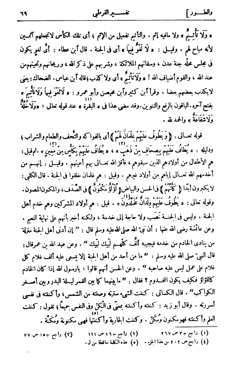 (وَلا تَأْثِيمٌ) وَلَا مَا فِيهِ إِثْمٌ. وَالتَّأْثِيمُ تَفْعِيلٌ مِنَ الْإِثْمِ، أَيْ تِلْكَ الْكَأْسُ لَا تَجْعَلُهُمْ آثِمِينَ لِأَنَّهُ مُبَاحٌ لَهُمْ. وَقِيلَ: (لَا لَغْوٌ فِيها) أَيْ فِي الْجَنَّةِ. قَالَ ابْنُ عَطَاءٍ: أَيُّ لَغْوٍ يَكُونُ فِي مَجْلِسٍ مَحَلُّهُ جَنَّةُ عَدْنٍ، وَسُقَاتُهُمُ الْمَلَائِكَةُ، وَشُرْبُهُمْ عَلَى ذِكْرِ اللَّهِ، وَرَيْحَانُهُمْ وَتَحِيَّتُهُمْ مِنْ عِنْدِ اللَّهِ، وَالْقَوْمُ أَضْيَافُ اللَّهِ! (وَلا تَأْثِيمٌ) أَيْ وَلَا كَذِبٌ، قَالَهُ ابْنُ عَبَّاسٍ. الضَّحَّاكُ: يَعْنِي لَا يُكَذِّبُ بَعْضُهُمْ بَعْضًا. وَقَرَأَ ابْنُ كَثِيرٍ وَابْنُ مُحَيْصِنٍ وَأَبُو عَمْرٍو: (لَا لَغْوٌ فِيها وَلا تَأْثِيمٌ) بِفَتْحِ آخِرِهِ. الْبَاقُونَ بِالرَّفْعِ وَالتَّنْوِينِ. وَقَدْ مَضَى هَذَا فِي (الْبَقَرَةِ) «١» عِنْدَ قَوْلِهِ تَعَالَى: (وَلا خُلَّةٌ وَلا شَفاعَةٌ) وَالْحَمْدُ لِلَّهِ. قَوْلُهُ تَعَالَى: (وَيَطُوفُ عَلَيْهِمْ غِلْمانٌ لَهُمْ) أَيْ بِالْفَوَاكِهِ وَالتُّحَفِ وَالطَّعَامِ وَالشَّرَابِ، وَدَلِيلُهُ: (يُطافُ عَلَيْهِمْ بِصِحافٍ مِنْ ذَهَبٍ) «٢»، (يُطافُ عَلَيْهِمْ بِكَأْسٍ مِنْ مَعِينٍ) «٣». ثُمَّ قِيلَ: هُمُ الْأَطْفَالُ مِنْ أَوْلَادِهِمُ الَّذِينَ سَبَقُوهُمْ، فَأَقَرَّ اللَّهُ تَعَالَى بِهِمْ أَعْيُنَهُمْ. وَقِيلَ: إِنَّهُمْ مَنْ أَخْدَمَهُمُ اللَّهُ تَعَالَى إِيَّاهُمْ مِنْ أَوْلَادِ غَيْرِهِمْ. وَقِيلَ: هُمْ غِلْمَانٌ خُلِقُوا فِي الْجَنَّةِ. قَالَ الْكَلْبِيُّ: لَا يَكْبُرُونَ أَبَدًا (كَأَنَّهُمْ) فِي الْحُسْنِ وَالْبَيَاضِ (لُؤْلُؤٌ مَكْنُونٌ) فِي الصَّدَفِ، وَالْمَكْنُونُ الْمَصُونُ. وَقَوْلُهُ تَعَالَى: (يَطُوفُ عَلَيْهِمْ وِلْدانٌ مُخَلَّدُونَ) «٤». قِيلَ: هُمْ أَوْلَادُ الْمُشْرِكِينَ وَهُمْ خَدَمُ أَهْلِ الْجَنَّةِ. وَلَيْسَ فِي الْجَنَّةِ نَصَبٌ وَلَا حَاجَةٌ إِلَى خِدْمَةٍ، وَلَكِنَّهُ أَخْبَرَ بِأَنَّهُمْ عَلَى نِهَايَةِ النَّعِيمِ. وَعَنْ عَائِشَةَ رَضِيَ اللَّهُ عَنْهَا: أَنَّ نَبِيَّ اللَّهِ صَلَّى اللَّهُ عَلَيْهِ وَسَلَّمَ قَالَ: (إِنَّ أَدْنَى أَهْلِ الْجَنَّةِ مَنْزِلَةً مَنْ يُنَادِي الْخَادِمَ مِنْ خَدَمِهِ فَيُجِيبُهُ أَلْفٌ كُلُّهُمْ لَبَّيْكَ لَبَّيْكَ (. وَعَنْ عَبْدِ اللَّهِ بْنِ عُمَرَ قَالَ: قَالَ النَّبِيُّ صَلَّى اللَّهُ عَلَيْهِ وَسَلَّمَ:) مَا مِنْ أَحَدٍ مِنْ أَهْلِ الْجَنَّةِ إِلَّا يَسْعَى عَلَيْهِ أَلْفُ غُلَامٍ كُلُّ غُلَامٍ عَلَى عَمَلٍ لَيْسَ عَلَيْهِ صَاحِبُهُ (. وَعَنِ الْحَسَنِ أَنَّهُمْ قَالُوا: يَا رَسُولَ اللَّهِ إِذَا كَانَ الْخَادِمُ كَاللُّؤْلُؤِ فَكَيْفَ يَكُونُ الْمَخْدُومُ؟ فَقَالَ:) مَا بَيْنَهُمَا كَمَا بَيْنَ الْقَمَرِ لَيْلَةَ الْبَدْرِ وَبَيْنَ أَصْغَرِ الْكَوَاكِبِ (. قَالَ الْكِسَائِيُّ: كَنَنْتُ الشَّيْءَ سَتَرْتُهُ وَصُنْتُهُ مِنَ الشَّمْسِ، وَأَكْنَنْتُهُ فِي نَفْسِي أَسْرَرْتُهُ. وَقَالَ أَبُو زَيْدٍ: كَنَنْتُهُ وَأَكْنَنْتُهُ بِمَعْنًى فِي الْكِنِّ وَفِي النَّفْسِ جَمِيعًا، تَقُولُ: كَنَنْتُ الْعِلْمَ وَأَكْنَنْتُهُ فَهُوَ مَكْنُونٌ وَمُكَنٌّ. وَكَنَنْتُ الْجَارِيَةَ وَأَكْنَنْتُهَا «٥» فَهِيَ مَكْنُونَةٌ ومكنة.