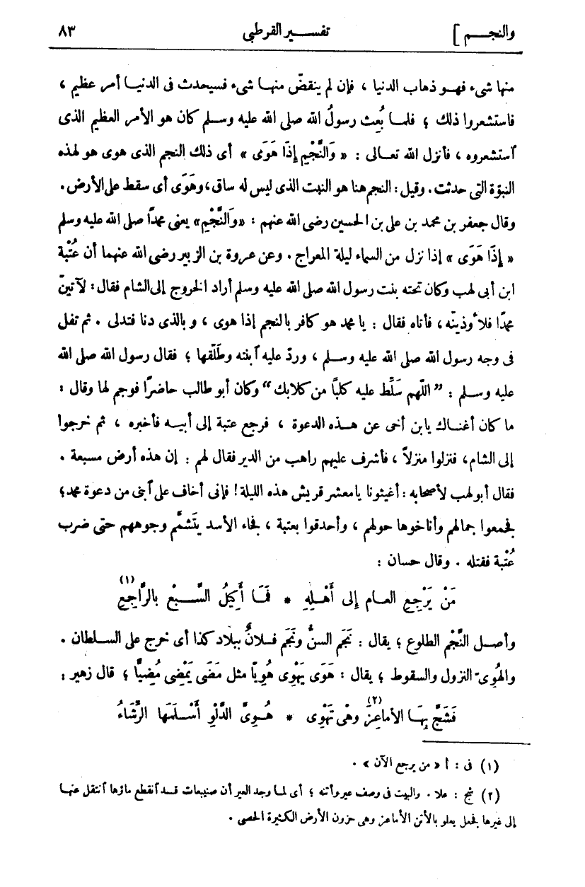 منها شي فَهُوَ ذَهَابُ الدُّنْيَا، فَإِنْ لَمْ يَنْقَضِ مِنْهَا شي فَسَيَحْدُثُ فِي الدُّنْيَا أَمْرٌ عَظِيمٌ، فَاسْتَشْعَرُوا ذَلِكَ، فَلَمَّا بُعِثَ رَسُولُ اللَّهِ صَلَّى اللَّهُ عَلَيْهِ وَسَلَّمَ كَانَ هُوَ الْأَمْرُ الْعَظِيمُ الَّذِي اسْتَشْعَرُوهُ، فَأَنْزَلَ اللَّهُ تَعَالَى: (وَالنَّجْمِ إِذا هَوى) أَيْ ذَلِكَ النَّجْمُ الَّذِي هَوَى هُوَ لِهَذِهِ النُّبُوَّةِ الَّتِي حَدَثَتْ. وَقِيلَ: النَّجْمُ هُنَا هُوَ النَّبْتُ الَّذِي لَيْسَ لَهُ سَاقٌ، وَهَوَى أَيْ سَقَطَ عَلَى الْأَرْضِ. وَقَالَ جَعْفَرُ بْنُ مُحَمَّدُ بْنُ عَلِيِّ بْنِ الْحُسَيْنِ رَضِيَ اللَّهُ عَنْهُمْ: (وَالنَّجْمِ) يَعْنِي مُحَمَّدًا صَلَّى اللَّهُ عَلَيْهِ وَسَلَّمَ (إِذا هَوى) إِذَا نَزَلَ مِنَ السَّمَاءِ لَيْلَةَ الْمِعْرَاجِ. وعن عروة ابن الزبير رضي الله عنهما أن عتبة ابن أَبِي لَهَبٍ وَكَانَ تَحْتَهُ بِنْتُ رَسُولِ اللَّهِ صَلَّى اللَّهُ عَلَيْهِ وَسَلَّمَ أَرَادَ الْخُرُوجَ إِلَى الشَّامِ فَقَالَ: لَآتِيَنَّ مُحَمَّدًا فَلَأُوذِيَنَّهُ، فَأَتَاهُ فَقَالَ: يَا مُحَمَّدُ هُوَ كَافِرٌ بِالنَّجْمِ إِذَا هَوَى، وَبِالَّذِي دَنَا فَتَدَلَّى. ثُمَّ تَفَلَ فِي وَجْهُ رَسُولِ اللَّهِ صَلَّى اللَّهُ عَلَيْهِ وَسَلَّمَ، وَرَدَّ عَلَيْهِ ابْنَتَهُ وَطَلَّقَهَا، فَقَالَ رَسُولُ اللَّهِ صَلَّى اللَّهُ عَلَيْهِ وَسَلَّمَ: (اللَّهُمَّ سَلِّطْ عَلَيْهِ كَلْبًا مِنْ كِلَابِكَ) وَكَانَ أَبُو طَالِبٍ حَاضِرًا فَوَجَمَ لها وقال: ما كان أغناك يا بن أَخِي عَنْ هَذِهِ الدَّعْوَةِ، فَرَجَعَ عُتْبَةُ إِلَى أَبِيهِ فَأَخْبَرَهُ، ثُمَّ خَرَجُوا إِلَى الشَّامِ، فَنَزَلُوا مَنْزِلًا، فَأَشْرَفَ عَلَيْهِمْ رَاهِبٌ مِنَ الدَّيْرِ فَقَالَ لَهُمْ: إِنَّ هَذِهِ أَرْضٌ مُسْبِعَةٌ. فَقَالَ أَبُو لَهَبٍ لِأَصْحَابِهِ: أَغِيثُونَا يَا مَعْشَرَ قُرَيْشٍ هَذِهِ اللَّيْلَةَ! فَإِنِّي أَخَافُ عَلَى ابْنِي مِنْ دَعْوَةِ مُحَمَّدٍ، فَجَمَعُوا جِمَالَهُمْ وَأَنَاخُوهَا حَوْلَهُمْ، وَأَحْدَقُوا بِعُتْبَةَ، فَجَاءَ الْأَسَدُ يَتَشَمَّمُ وُجُوهَهُمْ حَتَّى ضَرَبَ عُتْبَةَ فَقَتَلَهُ. وَقَالَ حَسَّانُ: