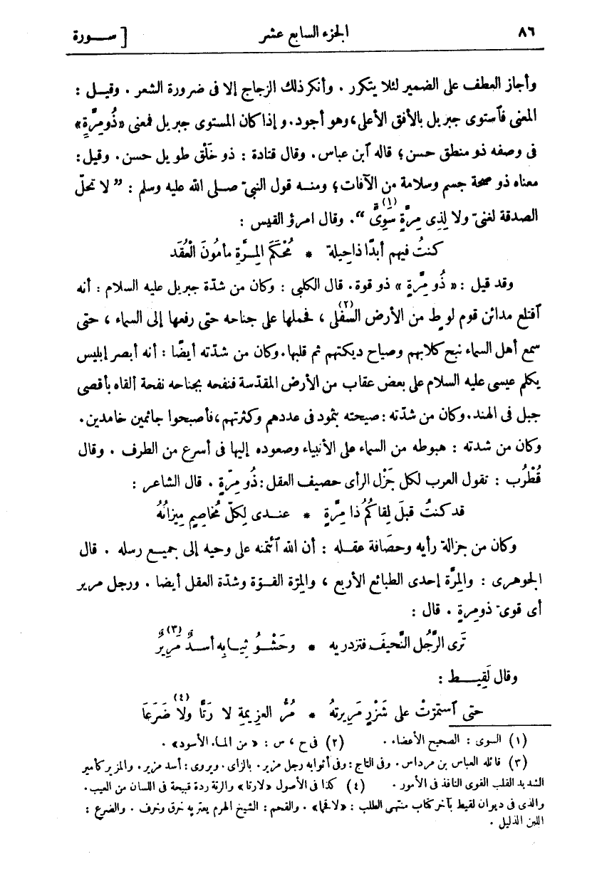 وَقَدْ قِيلَ: (ذُو مِرَّةٍ) ذُو قُوَّةٍ. قَالَ الْكَلْبِيُّ: وَكَانَ مِنْ شِدَّةِ جِبْرِيلَ عَلَيْهِ السَّلَامُ: أَنَّهُ اقْتَلَعَ مَدَائِنَ قَوْمِ لُوطٍ مِنَ الْأَرْضِ السُّفْلَى «٢»، فَحَمَلَهَا عَلَى جَنَاحِهِ حَتَّى رَفَعَهَا إِلَى السَّمَاءِ، حَتَّى سَمِعَ أَهْلُ السَّمَاءِ نَبْحَ كِلَابِهِمْ وَصِيَاحَ دِيَكَتِهِمْ ثُمَّ قَلَبَهَا. وَكَانَ مِنْ شِدَّتِهِ أَيْضًا: أَنَّهُ أَبْصَرَ إِبْلِيسَ يُكَلِّمُ عِيسَى عَلَيْهِ السَّلَامَ عَلَى بَعْضِ عُقَابٍ مِنَ الْأَرْضِ الْمُقَدَّسَةِ فَنَفَحَهُ بِجَنَاحِهِ نَفْحَةً أَلْقَاهُ بِأَقْصَى جَبَلٍ فِي الْهِنْدِ. وَكَانَ مِنْ شِدَّتِهِ: صَيْحَتُهُ بِثَمُودَ فِي عَدَدِهِمْ وَكَثْرَتِهِمْ، فَأَصْبَحُوا جَاثِمِينَ خَامِدِينَ. وَكَانَ مِنْ شِدَّتِهِ: هُبُوطُهُ مِنَ السَّمَاءِ عَلَى الْأَنْبِيَاءِ وَصُعُودُهُ إِلَيْهَا فِي أَسْرَعَ مِنَ الطَّرْفِ. وَقَالَ قُطْرُبٌ: تَقُولُ الْعَرَبُ لِكُلِّ جَزْلِ الرَّأْيِ حَصِيفِ الْعَقْلِ: ذُو مِرَّةٍ. قَالَ الشَّاعِرُ: