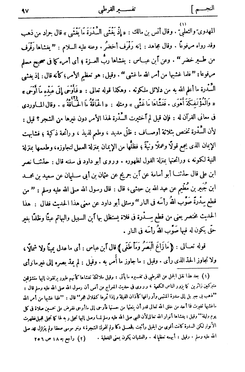 (وَالْمُؤْتَفِكَةَ أَهْوى. فَغَشَّاها مَا غَشَّى) وَمِثْلُهُ: (الْحَاقَّةُ مَا الْحَاقَّةُ) «٢». وَقَالَ الْمَاوَرْدِيُّ فِي مَعَانِي الْقُرْآنِ لَهُ: فَإِنْ قِيلَ لِمَ اخْتِيرَتِ السِّدْرَةُ لِهَذَا الْأَمْرِ دُونَ غَيْرِهَا مِنَ الشَّجَرِ؟ قِيلَ: لِأَنَّ السِّدْرَةَ تَخْتَصُّ بِثَلَاثَةِ أَوْصَافٍ: ظِلٌّ مَدِيدٌ، وَطَعْمٌ لَذِيذٌ، وَرَائِحَةٌ ذَكِيَّةٌ، فَشَابَهَتِ الْإِيمَانَ الَّذِي يَجْمَعُ قَوْلًا وَعَمَلًا وَنِيَّةً، فَظِلُّهَا مِنَ الْإِيمَانِ بِمَنْزِلَةِ الْعَمَلِ لِتَجَاوُزِهِ، وَطَعْمُهَا بِمَنْزِلَةِ النِّيَّةِ لِكُمُونِهِ، وَرَائِحَتُهَا بِمَنْزِلَةِ الْقَوْلِ لِظُهُورِهِ. وَرَوَى أَبُو دَاوُدَ فِي سُنَنِهِ قَالَ: حدثنا نصر ابن عَلِيٍّ قَالَ حَدَّثَنَا أَبُو أُسَامَةَ عَنِ ابْنِ جُرَيْجٍ عَنْ عُثْمَانَ بْنِ أَبِي سُلَيْمَانَ عَنْ سعيد بن محمد ابن جُبَيْرِ بْنِ مُطْعِمٍ عَنْ عَبْدِ اللَّهِ بْنِ حَبَشِيٍّ، قَالَ: قَالَ رَسُولُ اللَّهِ صَلَّى اللَّهُ عَلَيْهِ وَسَلَّمَ: (مَنْ قَطَعَ سِدْرَةً صَوَّبَ اللَّهُ رأسه في النار) وسيل أَبُو دَاوُدَ عَنْ مَعْنَى هَذَا الْحَدِيثِ فَقَالَ: هَذَا الْحَدِيثُ مُخْتَصَرٌ يَعْنِي مَنْ قَطَعَ سِدْرَةً فِي فَلَاةٍ يَسْتَظِلُّ بِهَا ابْنُ السَّبِيلِ وَالْبَهَائِمُ عَبَثًا وَظُلْمًا بِغَيْرِ حَقٍّ يَكُونُ لَهُ فِيهَا صَوَّبَ اللَّهُ رَأْسَهُ فِي النَّارِ. قَوْلُهُ تَعَالَى: (مَا زاغَ الْبَصَرُ وَما طَغى) قَالَ ابْنُ عَبَّاسٍ: أَيْ مَا عَدَلَ يَمِينًا وَلَا شِمَالًا، وَلَا تَجَاوَزَ الْحَدَّ الَّذِي رَأَى. وَقِيلَ: مَا جَاوَزَ مَا أُمِرَ بِهِ. وَقِيلَ: لَمْ يَمُدَّ بصره إلى غير ما رأى