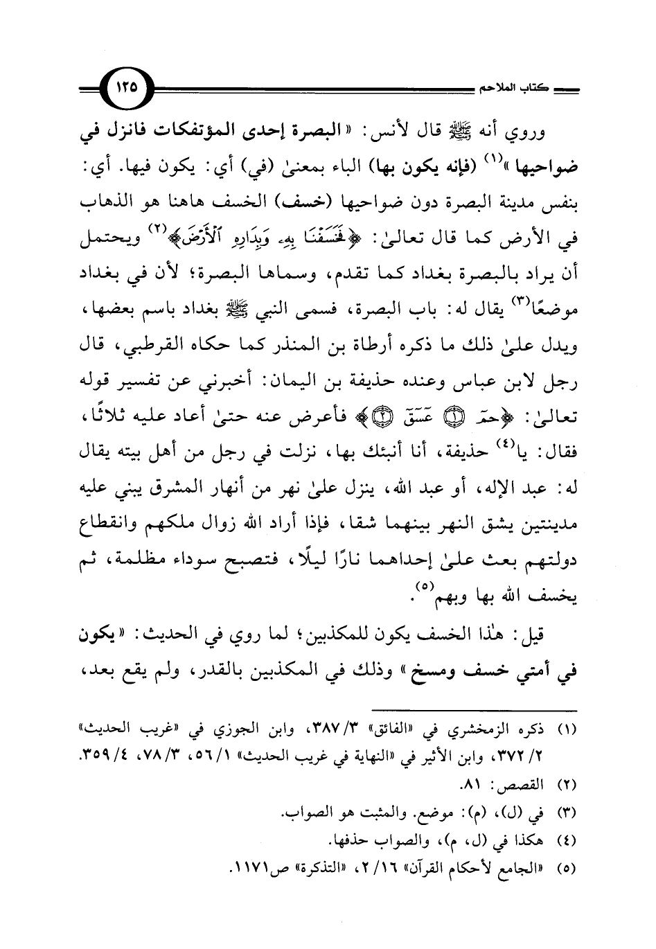 وروي أنه -صلى اللَّه عليه وسلم- قال لأنس: "البصرة إحدى المؤتفكات فانزل في ضواحيها" (¬1) (فإنه يكون بها) الباء بمعنى (في) أي: يكون فيها. أي: بنفس مدينة البصرة دون ضواحيها (خسف) الخسف هاهنا هو الذهاب في الأرض كما قال تعالى: {فَخَسَفْنَا بِهِ وَبِدَارِهِ الْأَرْضَ} (¬2) ويحتمل أن يراد بالبصرة بغداد كما تقدم، وسماها البصرة؛ لأن في بغداد موضعًا (¬3) يقال له: باب البصرة، فسمى النبي -صلى اللَّه عليه وسلم- بغداد باسم بعضها، ويدل على ذلك ما ذكره أرطاة بن المنذر كما حكاه القرطبي، قال رجل لابن عباس وعنده حذيفة بن اليمان: أخبرني عن تفسير قوله تعالى: {حم (1) عسق (2)} فأعرض عنه حتى أعاد عليه ثلاثًا، فقال: يا (¬4) حذيفة، أنا أنبئك بها، نزلت في رجل من أهل بيته يقال له: عبد الإله، أو عبد اللَّه، ينزل على نهر من أنهار المشرق يبني عليه مدينتين يشق النهر بينهما شقا، فإذا أراد اللَّه زوال ملكهم وانقطاع دولتهم بعث على إحداهما نارًا ليلًا، فتصبح سوداء مظلمة، ثم يخسف اللَّه بها وبهم (¬5).