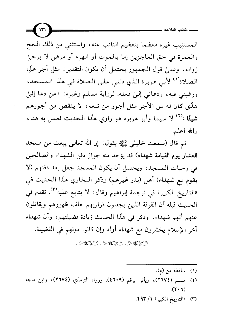 ثم قال (سمعت خليلي -صلى اللَّه عليه وسلم- يقول: إن اللَّه تعالى يبعث من مسجد العشار يوم القيامة شهداء) قد يؤخذ منه جواز دفن الشهداء والصالحين في رحبات المسجد، ويحتمل أن يكون المسجد جعل بعد دفنهم (لا يقوم مع شهداء) أهل (بدر غيرهم) وذكر البخاري هذا الحديث في "التاريخ الكبير" في ترجمة إبراهيم وقال: لا يتابع عليه (¬3). تقدم في الحديث قبله أن الفرقة الذين يجعلون ذراريهم خلف ظهورهم ويقاتلون عنهم أنهم شهداء، وذكر في هذا الحديث زيادة فضيلتهم، وأن شهداء آخر الإسلام يحشرون مع شهداء أوله وإن كانوا دونهم في الفضيلة.