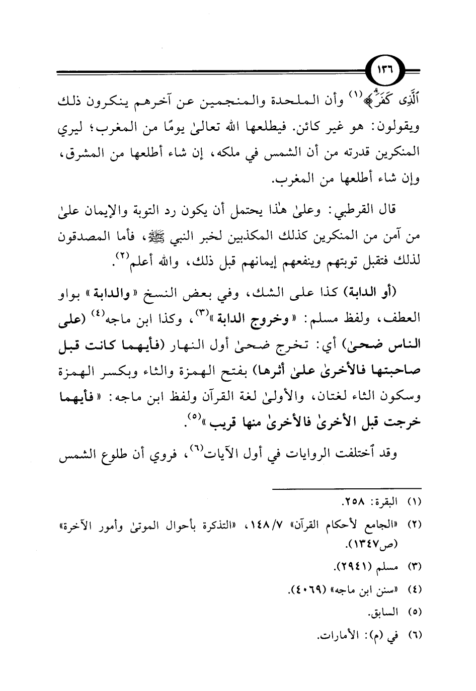 الَّذِي كَفَرَ} (¬1) وأن الملحدة والمنجمين عن آخرهم ينكرون ذلك ويقولون: هو غير كائن. فيطلعها اللَّه تعالى يومًا من المغرب؛ ليري المنكرين قدرته من أن الشمس في ملكه، إن شاء أطلعها من المشرق، وإن شاء أطلعها من المغرب.