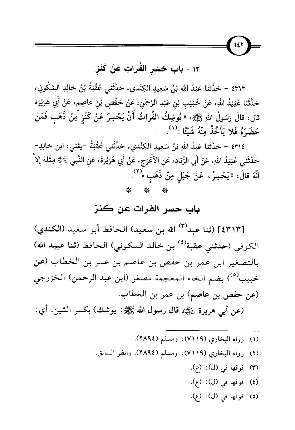 [4313] (ثنا عبد (¬3) اللَّه بن سعيد) الحافظ أبو سعيد (الكندي) الكوفي (حدثني عقبة (¬4) بن خالد السكوني) الحافظ (ثنا عبيد اللَّه) بالتصغير ابن عمر بن حفص بن عاصم بن عمر بن الخطاب (عن خبيب) (¬5) بضم الخاء المعجمة مصغر (ابن عبد الرحمن) الخزرجي (عن حفص بن عاصم) بن عمر بن الخطاب.