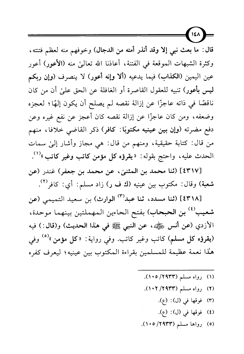 [4317] (ثنا محمد بن المثنى، عن محمد بن جعفر) غندر (عن شعبة) وقال: مكتوب بين عينيه (ك ف ر) زاد مسلم: أي: كافر (¬2).