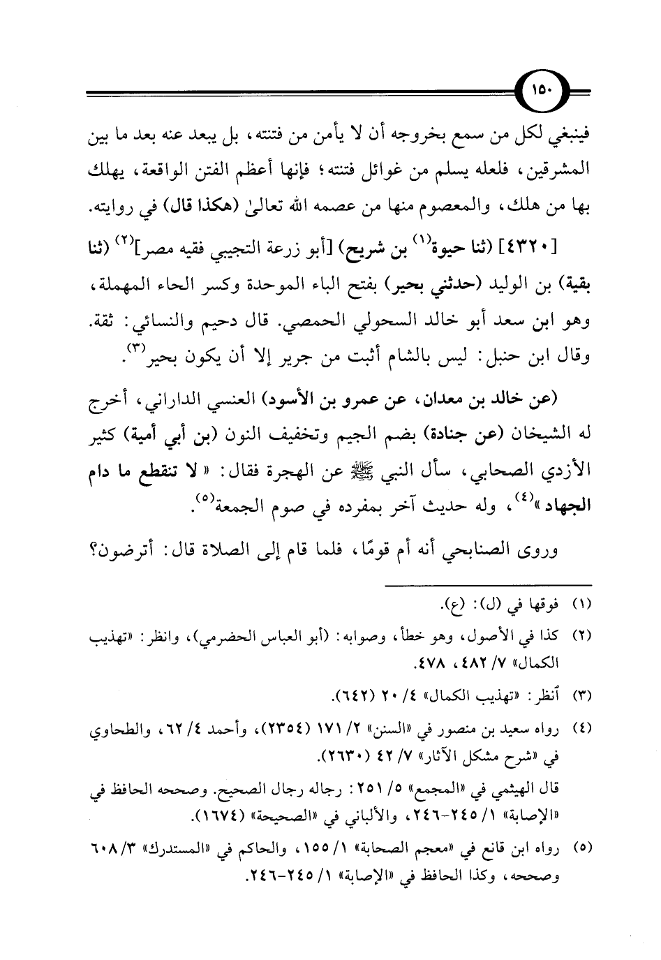 [4320] (ثنا حيوة (¬1) بن شريح) [أبو زرعة التجيبي فقيه مصر] (¬2) (ثنا بقية) بن الوليد (حدثني بحير) بفتح الباء الموحدة وكسر الحاء المهملة، وهو ابن سعد أبو خالد السحولي الحمصي. قال دحيم والنسائي: ثقة. وقال ابن حنبل: ليس بالشام أثبت من جرير إلا أن يكون بحير (¬3).