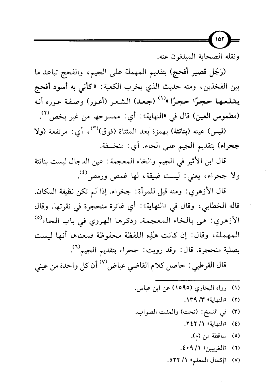 قال ابن الأثير في الجيم والخاء المعجمة: عين الدجال ليست بناتئة ولا جحراء، يعني: ليست ضيقة، لها غمص ورمص (¬4).