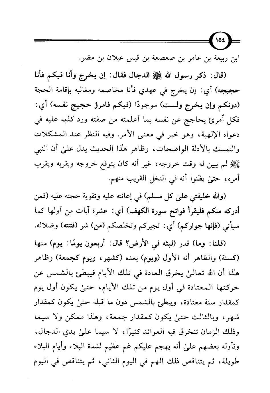 (قال: ذكر رسول اللَّه -صلى اللَّه عليه وسلم- الدجال فقال: إن يخرج وأنا فيكم فأنا حجيجه) أي: إن يخرج في عهدي فأنا مخاصمه ومغالبه بإقامة الحجة (دونكم وإن يخرج ولست) موجودًا (فيكم فامرؤ حجيج نفسه) أي: فكل امرئ يحاجج عن نفسه بما أعلمته من صفته ورد كذبه عليه في دعواه الإلهية، وهو خبر في معنى الأمر. وفيه النظر عند المشكلات والتمسك بالأدلة الواضحات، وظاهر هذا الحديث يدل على أن النبي -صلى اللَّه عليه وسلم- لم يبين له وقت خروجه، غير أنه كان يتوقع خروجه وبقربه وبقرب أمره، حتى يظنوا أنه في النخل القريب منهم.