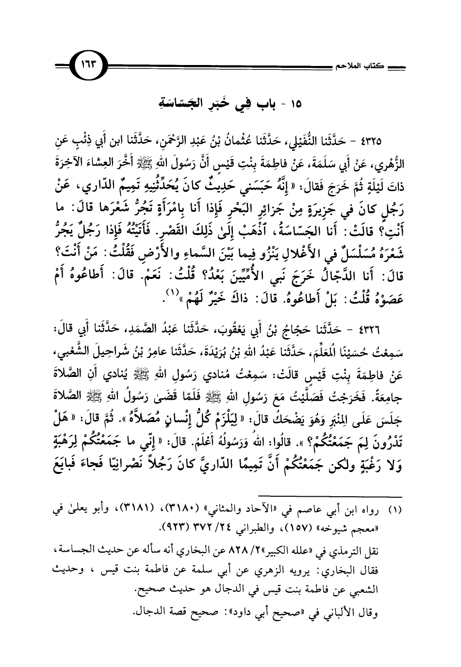 4325 - حَدَّثَنا النُّفَيْلي، حَدَّثَنا عُثْمانُ بْن عَبْدِ الرَّحْمَنِ، حَدَّثَنا ابن أَبي ذِئْبٍ عَنِ الزُّهْري، عَنْ أَبي سَلَمَةَ، عَنْ فاطِمَةَ بِنْتِ قَيْسٍ أَنَّ رَسُولَ اللَّهِ -صلى اللَّه عليه وسلم- أَخَّرَ العِشاءَ الآخِرَةَ ذاتَ لَيْلَةٍ ثُمَّ خَرَجَ فَقالَ: "إِنَّهُ حَبَسَني حَدِيثٌ كانَ يُحَدِّثُنِيهِ تَمِيمٌ الدّاري، عَنْ رَجُلٍ كانَ في جَزِيرَةٍ مِنْ جَزائِرِ البَحْرِ فَإِذا أَنا بِامْرَأَةٍ تَجُرُّ شَعْرَها قالَ: ما أَنْتِ؟ قالَتْ: أَنا الجَسّاسَةُ، اذْهَبْ إِلَى ذَلِكَ القَصْرِ. فَأَتَيْتُهُ فَإِذا رَجُلٌ يَجُرُّ شَعْرَهُ مُسَلْسَلٌ في الأَغْلالِ يَنْزُو فِيما بَيْنَ السَّماءِ والأَرْضِ فَقُلْتُ: مَنْ أَنْتَ؟ قالَ: أَنا الدَّجّالُ خَرَجَ نَبي الأُمِّيِّينَ بَعْدُ؟ قُلْتُ: نَعَمْ. قالَ: أَطاعُوهُ أَمْ عَصَوْهُ قُلْتُ: بَلْ أَطاعُوهُ. قالَ: ذاكَ خَيْرٌ لَهُمْ" (¬1).