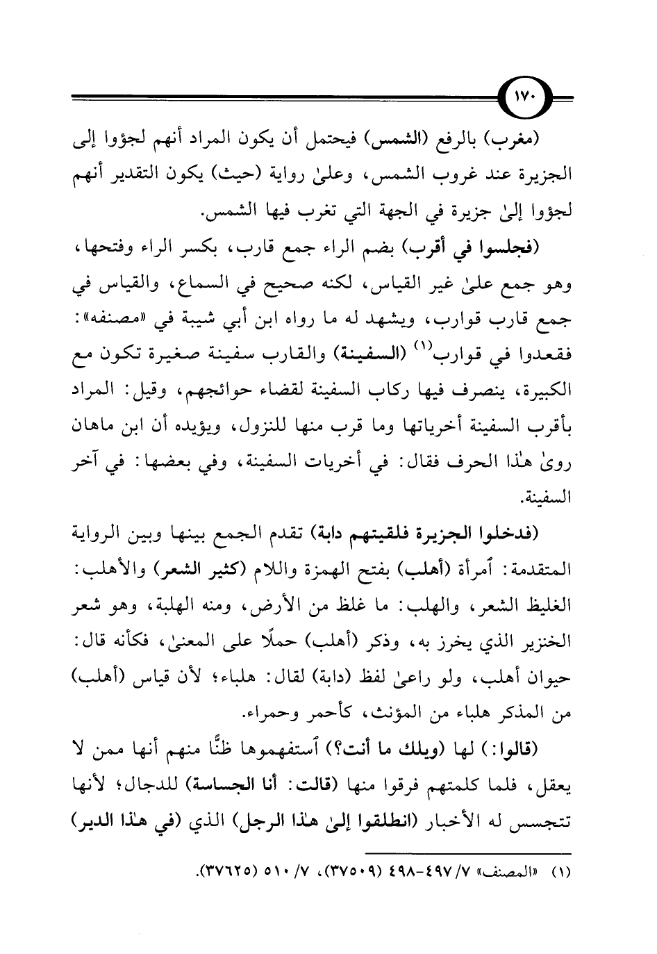 (مغرب) بالرفع (الشمس) فيحتمل أن يكون المراد أنهم لجؤوا إلى الجزيرة عند غروب الشمس، وعلى رواية (حيث) يكون التقدير أنهم لجؤوا إلى جزيرة في الجهة التي تغرب فيها الشمس.