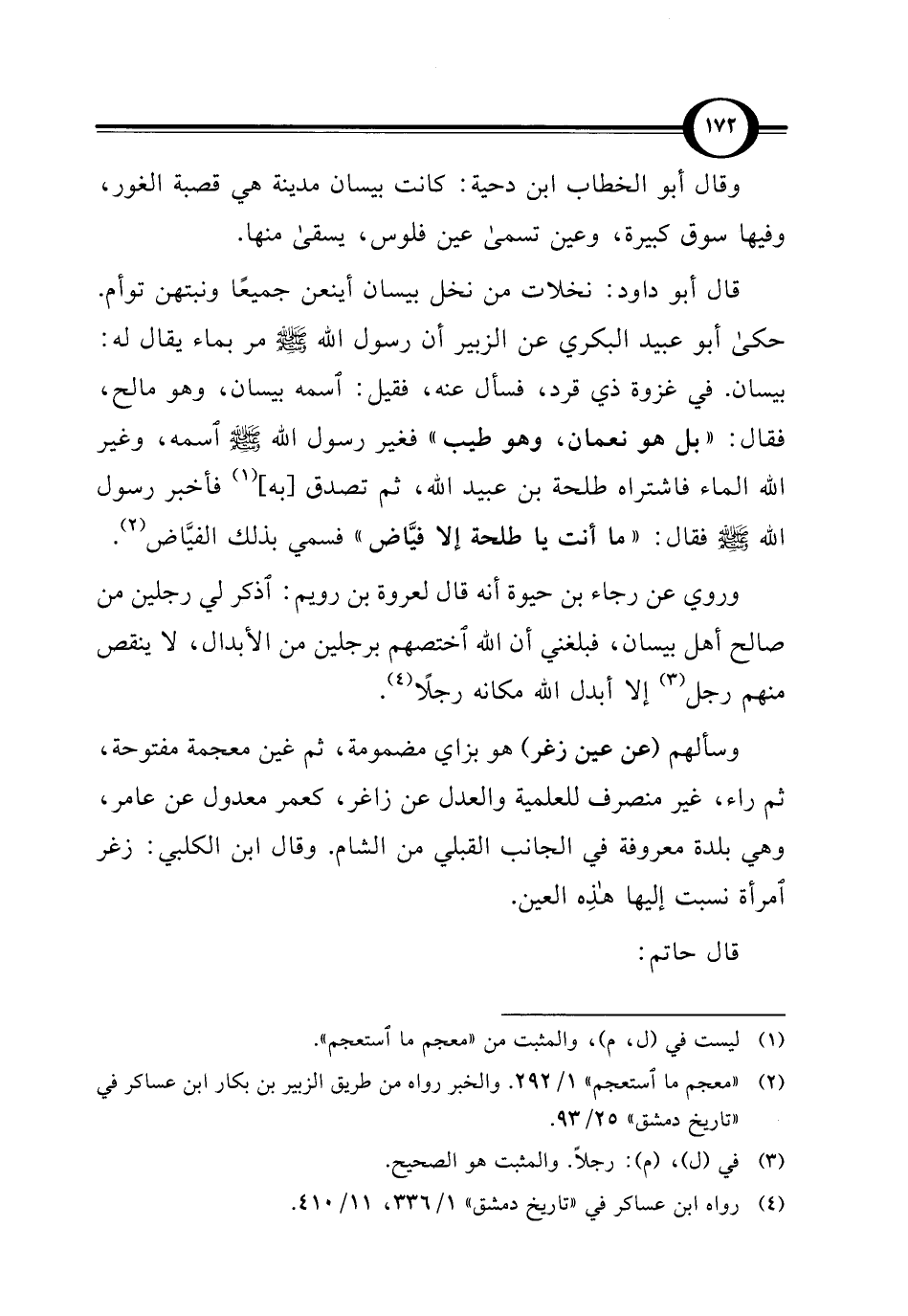 قال أبو داود: نخلات من نخل بيسان أينعن جميعًا ونبتهن توأم. حكى أبو عبيد البكري عن الزبير أن رسول اللَّه -صلى اللَّه عليه وسلم- مر بماء يقال له: بيسان. في غزوة ذي قرد، فسأل عنه، فقيل: اسمه بيسان، وهو مالح، فقال: "بل هو نعمان، وهو طيب" فغير رسول اللَّه -صلى اللَّه عليه وسلم- اسمه، وغير اللَّه الماء فاشتراه طلحة بن عبيد اللَّه، ثم تصدق [به] (¬1) فأخبر رسول اللَّه -صلى اللَّه عليه وسلم- فقال: "ما أنت يا طلحة إلا فيَّاض" فسمي بذلك الفيَّاض (¬2).