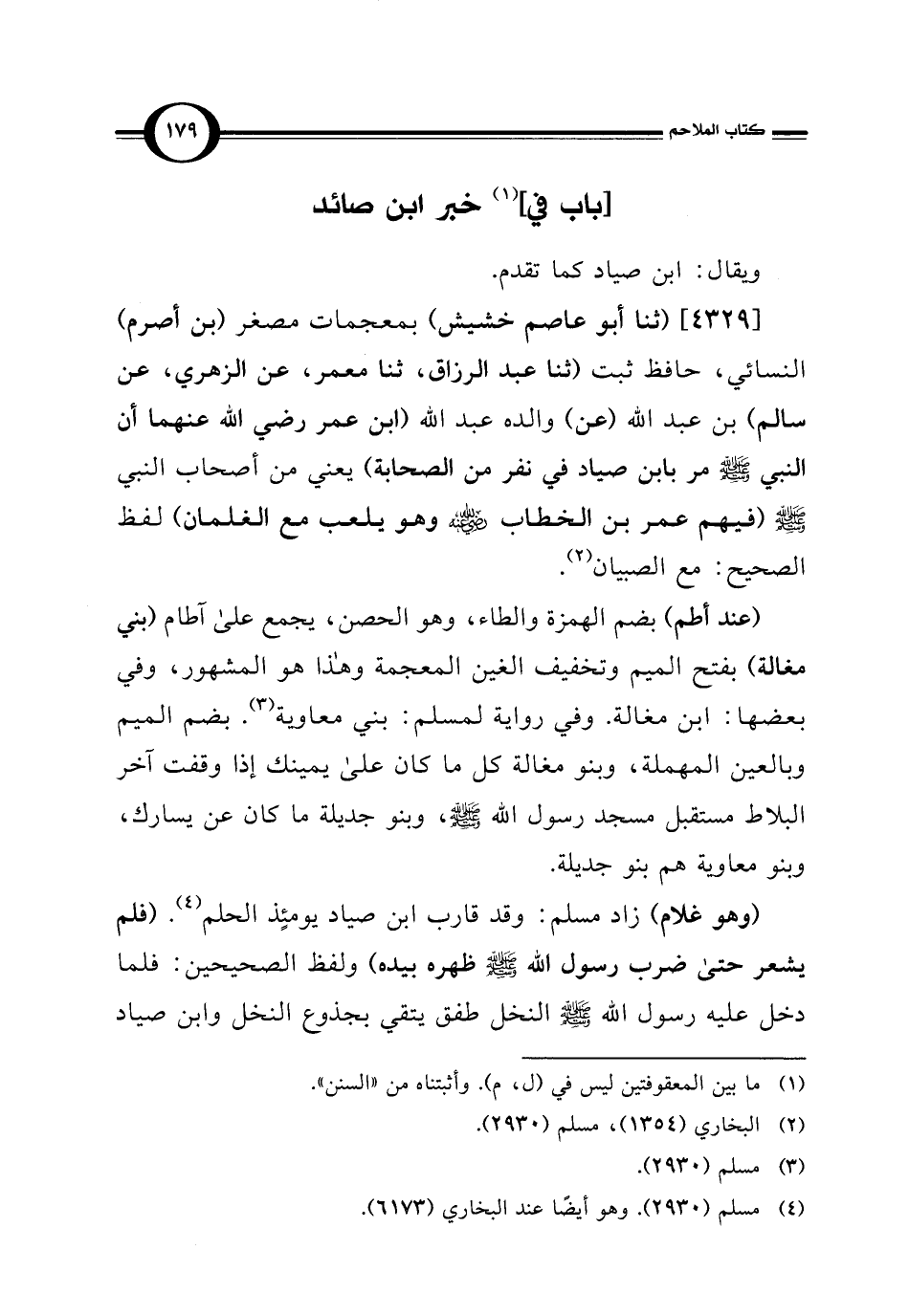 [4329] (ثنا أبو عاصم خشيش) بمعجمات مصغر (بن أصرم) النسائي، حافظ ثبت (ثنا عبد الرزاق، ثنا معمر، عن الزهري، عن سالم) بن عبد اللَّه (عن) والده عبد اللَّه (ابن عمر رضي اللَّه عنهما أن النبي -صلى اللَّه عليه وسلم- مر بابن صياد في نفر من الصحابة) يعني من أصحاب النبي -صلى اللَّه عليه وسلم- (فيهم عمر بن الخطاب -رضي اللَّه عنه- وهو يلعب مع الغلمان) لفظ الصحيح: مع الصبيان (¬2).