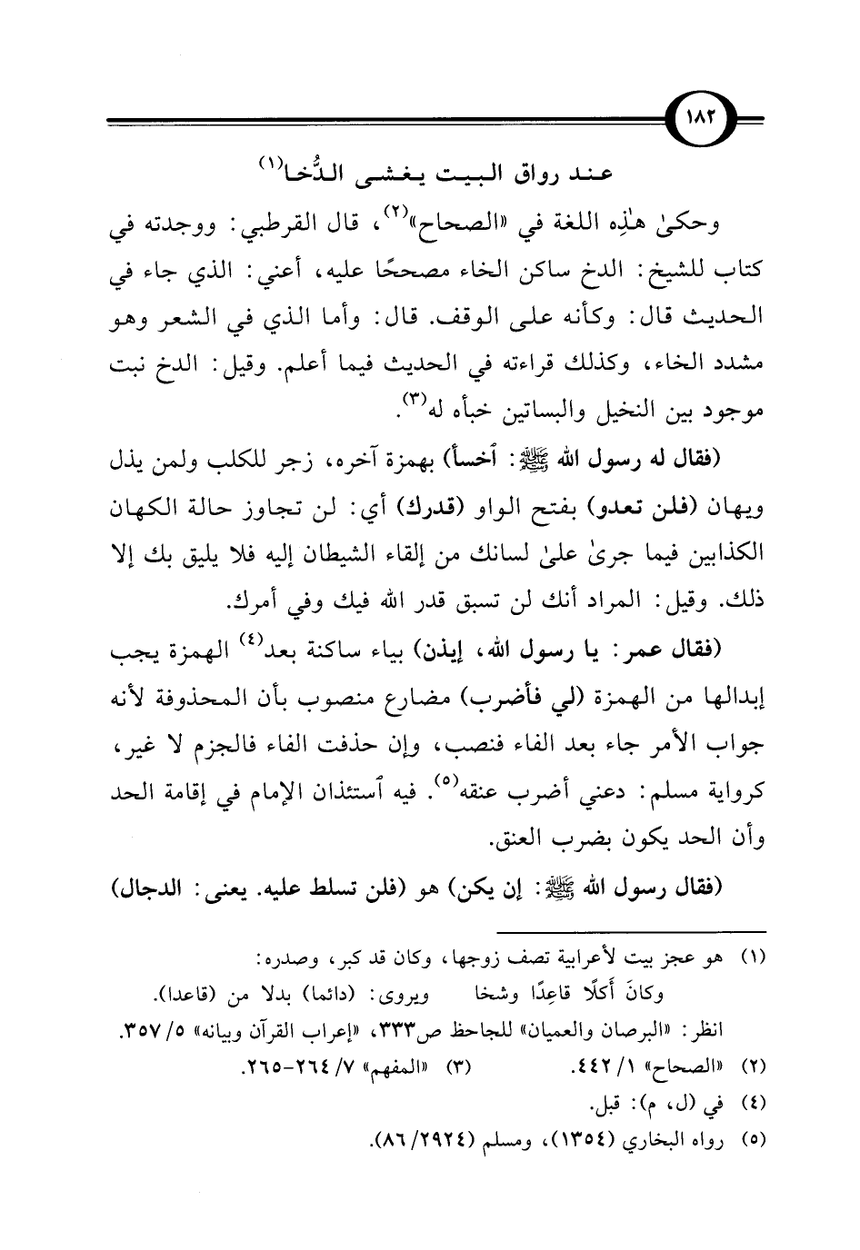وحكى هذِه اللغة في "الصحاح" (¬2)، قال القرطبي: ووجدته في كتاب للشيخ: الدخ ساكن الخاء مصححًا عليه، أعني: الذي جاء في الحديث قال: وكأنه على الوقف. قال: وأما الذي في الشعر وهو مشدد الخاء، وكذلك قراءته في الحديث فيما أعلم. وقيل: الدخ نبت موجود بين النخيل والبساتين خبأه له (¬3).