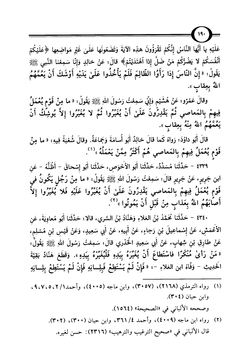 4339 - حَدَّثَنا مُسَدَّدٌ، حَدَّثَنا أَبُو الأَحْوَصِ، حَدَّثَنا أَبُو إِسْحاقَ -أَظُنُّهُ- عَنِ ابن جَرِيرٍ، عَنْ جَرِيرٍ قالَ: سَمِعْتُ رَسُولَ اللَّهِ -صلى اللَّه عليه وسلم- يَقُولُ: "ما مِنْ رَجُلٍ يَكُونُ في قَوْمٍ يُعْمَلُ فِيهِمْ بِالمَعاصي يَقْدِرُونَ عَلَى أَنْ يُغَيِّرُوا عَلَيْهِ فَلا يُغَيِّرُوا إِلَّا أَصابَهُمُ اللَّهُ بِعَذابٍ مِنْ قَبْلِ أَنْ يَمُوتُوا" (¬2).