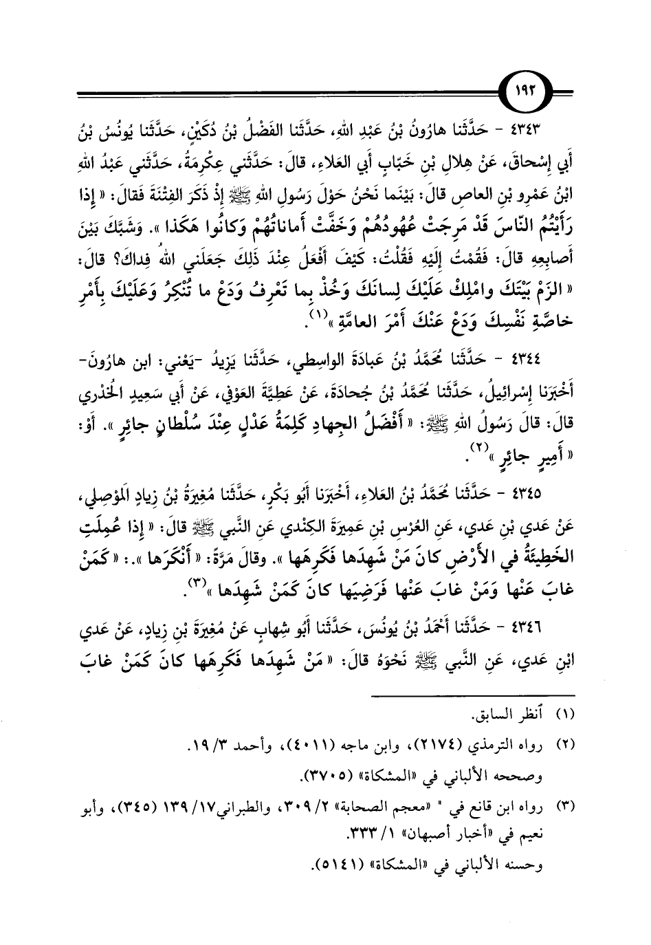 4343 - حَدَّثَنا هارُونُ بْنُ عَبْدِ اللَّهِ، حَدَّثَنا الفَضْل بْنُ دُكَيْنٍ، حَدَّثَنا يُونُسُ بْنُ أَبي إِسْحاقَ، عَنْ هِلالِ بْنِ خَبّابٍ أَبي العَلاءِ، قالَ: حَدَّثَني عِكْرِمَةُ، حَدَّثَني عَبْدُ اللَّهِ ابْن عَمْرِو بْنِ العاصِ قالَ: بَيْنَما نَحْنُ حَوْلَ رَسُولِ اللَّهِ -صلى اللَّه عليه وسلم- إِذْ ذَكَرَ الفِتْنَةَ فَقالَ: "إِذا رَأَيْتُمُ النّاسَ قَدْ مَرِجَتْ عُهُودُهُمْ وَخَفَّتْ أَماناتُهُمْ وَكانُوا هَكَذا". وَشَبَّكَ بَيْنَ أَصابِعِهِ قالَ: فَقُمْتُ إِلَيْهِ فَقُلْتُ: كَيْفَ أَفْعَل عِنْدَ ذَلِكَ جَعَلَني اللَّهُ فِداكَ؟ قالَ: "الزَمْ بَيْتَكَ وامْلِكْ عَلَيْكَ لِسانَكَ وَخُذْ بما تَعْرِفُ وَدَعْ ما تُنْكِرُ وَعَلَيْكَ بِأَمْرِ خاصَّةِ نَفْسِكَ وَدَعْ عَنْكَ أَمْرَ العامَّةِ" (¬1).