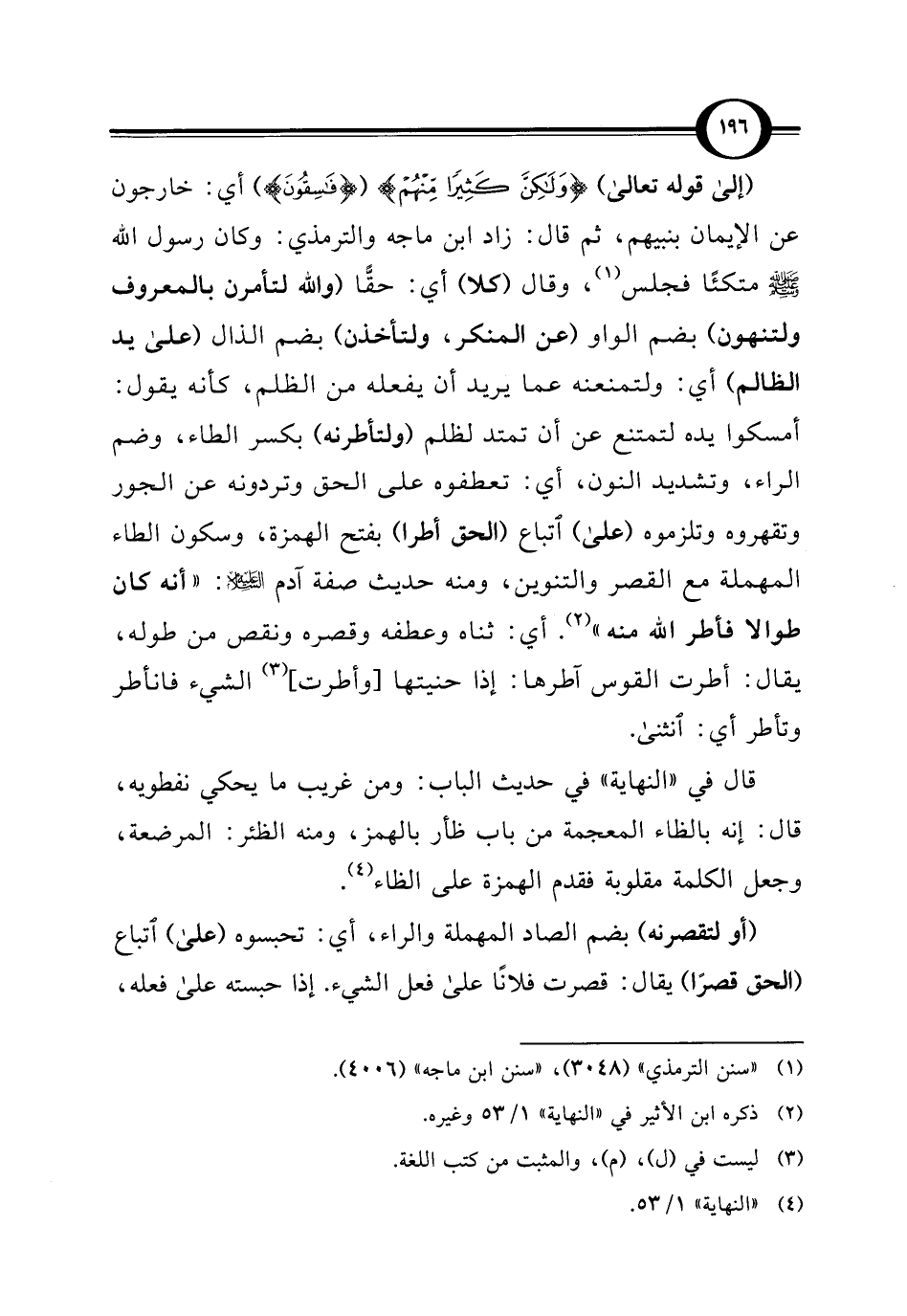 (إلى قوله تعالى) {وَلَكِنَّ كَثِيرًا مِنْهُمْ} ({فَاسِقُونَ}) أي: خارجون عن الإيمان بنبيهم، ثم قال: زاد ابن ماجه والترمذي: وكان رسول اللَّه -صلى اللَّه عليه وسلم- متكئًا فجلس (¬1)، وقال (كلا) أي: حقًّا (واللَّه لتأمرن بالمعروف ولتنهون) بضم الواو (عن المنكر، ولتأخذن) بضم الذال (على يد الظالم) أي: ولتمنعنه عما يريد أن يفعله من الظلم، كأنه يقول: أمسكوا يده لتمتنع عن أن تمتد لظلم (ولتأطرنه) بكسر الطاء، وضم الراء، وتشديد النون، أي: تعطفوه على الحق وتردونه عن الجور وتقهروه وتلزموه (على) اتباع (الحق أطرا) بفتح الهمزة، وسكون الطاء المهملة مع القصر والتنوين، ومنه حديث صفة آدم عليه السلام: "أنه كان طوالا فأطر اللَّه منه" (¬2). أي: ثناه وعطفه وقصره ونقص من طوله، يقال: أطرت القوس آطرها: إذا حنيتها [وأطرت] (¬3) الشيء فانأطر وتأطر أي: انثنى.
