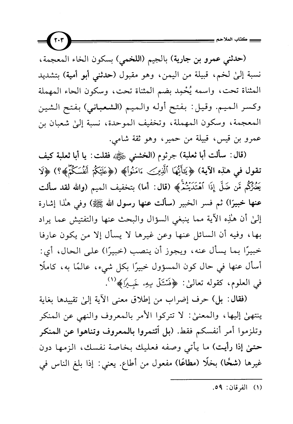 (قال: سألت أبا ثعلبة) جرثوم (الخشني -رضي اللَّه عنه- فقلت: يا أبا ثعلبة كيف تقول في هذِه الآية) {يَاأَيُّهَا الَّذِينَ آمَنُوا} ({عَلَيْكُمْ أَنْفُسَكُمْ}؟ ) {لَا يَضُرُّكُمْ مَنْ ضَلَّ إِذَا اهْتَدَيْتُمْ} (قال: أما) بتخفيف الميم (واللَّه لقد سألت عنها خبيرًا) ثم فسر الخبير (سألت عنها رسول اللَّه -صلى اللَّه عليه وسلم-) وفي هذا إشارة إلى أن هذِه الآية مما ينبغي السؤال والبحث عنها والتفتيش عما يراد بها، وفيه أن السائل عنها وعن غيرها لا يسأل إلا من يكون عارفا خبيرًا بما يسأل عنه، ويجوز أن ينصب (خبيرًا) على الحال، أي: أسأل عنها في حال كون المسؤول خبيرًا بكل شيء، عالمًا به، كاملًا في العلوم، كقوله تعالى: {فَاسْأَلْ بِهِ خَبِيرًا} (¬1).