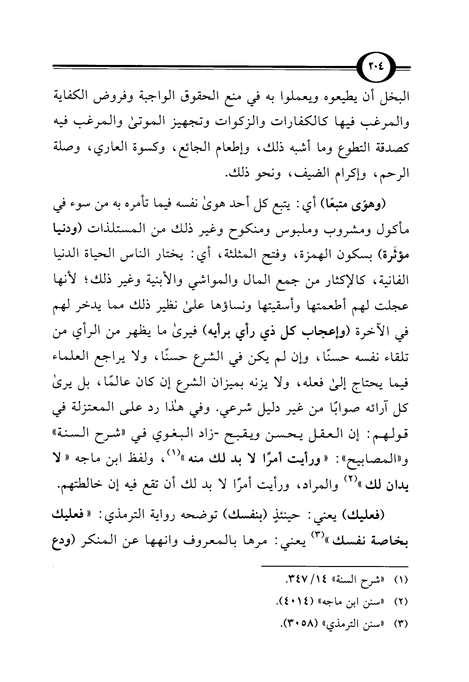 (وهوًى متبعًا) أي: يتبع كل أحد هوى نفسه فيما تأمره به من سوء في مأكول ومشروب وملبوس ومنكوح وغير ذلك من المستلذات (ودنيا مؤثَرة) بسكون الهمزة، وفتح المثلثة، أي: يختار الناس الحياة الدنيا الفانية، كالإكثار من جمع المال والمواشي والأبنية وغير ذلك؛ لأنها عجلت لهم أطعمتها وأسقيتها ونساؤها على نظير ذلك مما يدخر لهم في الآخرة (وإعجاب كل ذي رأي برأيه) فيرى ما يظهر من الرأي من تلقاء نفسه حسنًا، وإن لم يكن في الشرع حسنًا، ولا يراجع العلماء فيما يحتاج إلى فعله، ولا يزنه بميزان الشرع إن كان عالمًا، بل يرى كل آرائه صوابًا من غير دليل شرعي. وفي هذا رد على المعتزلة في قولهم: إن العقل يحسن ويقبح - زاد البغوي في "شرح السنة" و"المصابيح": "ورأيت أمرًا لا بد لك منه" (¬1)، ولفظ ابن ماجه "لا يدان لك" (¬2) والمراد، ورأيت أمرًا لا بد لك أن تقع فيه إن خالطتهم.