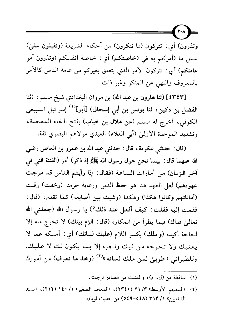 (قال: حدثني عكرمة، قال: حدثني عبد اللَّه بن عمرو بن العاص رضي اللَّه عنهما قال: بينما نحن حول رسول اللَّه -صلى اللَّه عليه وسلم- إذ ذكر) أمر (الفتنة التي في آخر الزمان) من أمارات الساعة (فقال: إذا رأيتم الناس قد مرجت عهودهم) لعل العهد هنا هو حفظ الدين ورعاية حرمته (وخفت) وقلت (أماناتهم وكانوا هكذا) وهكذا (وشبك بين أصابعه) كما تقدم، (قال: فقمت إليه فقلت: كيف أفعل عند ذلك؟ ) يا رسول اللَّه (جعلني اللَّه تعالى فداك) فيما يطرأ من المكاره (قال: الزم بيتك) لا تخرج منه إلا لحاجة أكيدة (واملك) بكسر اللام (عليك لسانك) أي: أمسكه عما لا يعنيك ولا تخرجه من فيك وتجره إلا بما يكون لك لا عليك. وللطبراني "طوبى لمن ملك لسانه" (¬2) (وخذ ما تعرف) من أمورك