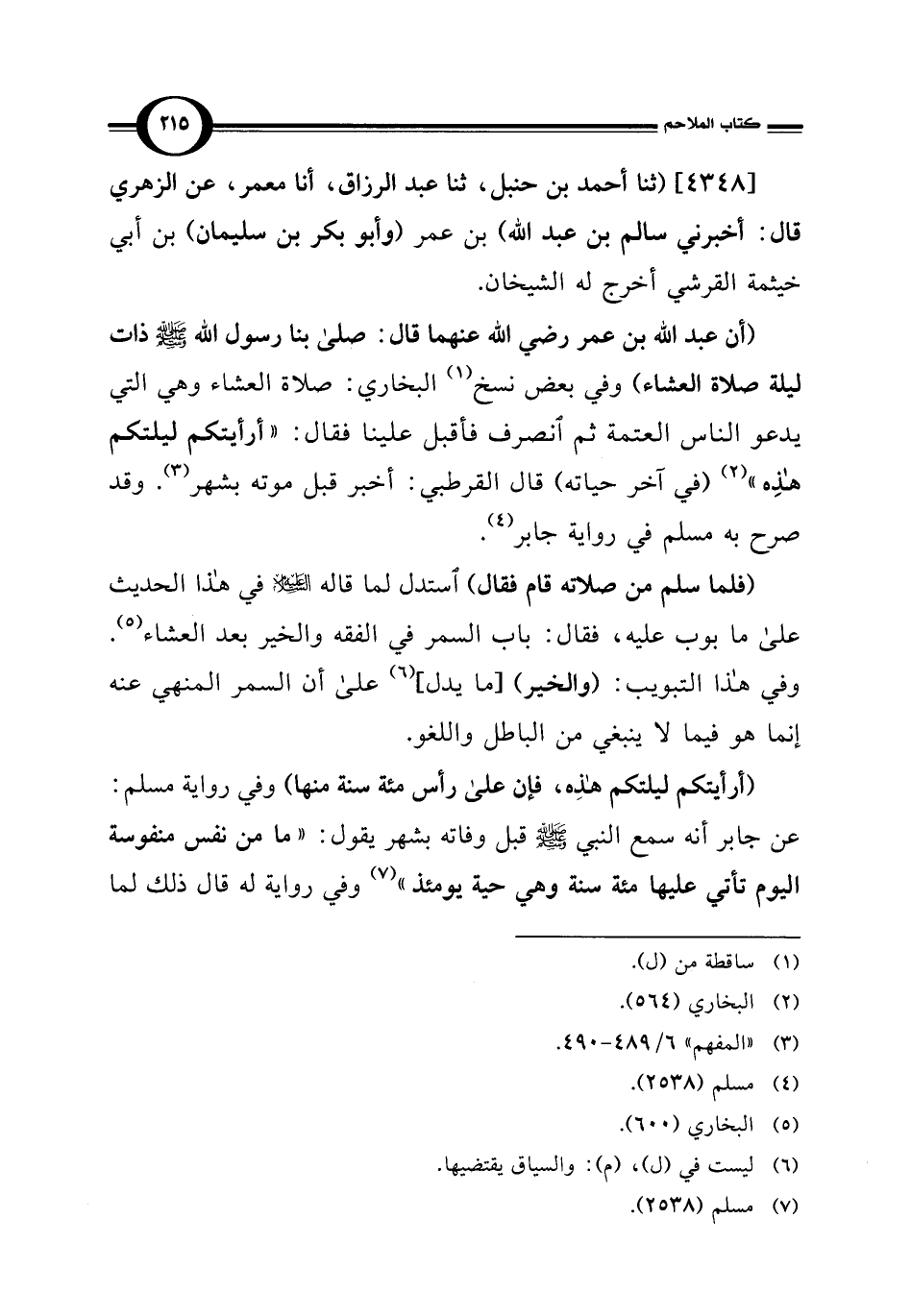 (أن عبد اللَّه بن عمر رضي اللَّه عنهما قال: صلى بنا رسول اللَّه -صلى اللَّه عليه وسلم- ذات ليلة صلاة العشاء) وفي بعض نسخ (¬1) البخاري: صلاة العشاء وهي التي يدعو الناس العتمة ثم انصرف فأقبل علينا فقال: "أرأيتكم ليلتكم هذِه" (¬2) (في آخر حياته) قال القرطبي: أخبر قبل موته بشهر (¬3). وقد صرح به مسلم في رواية جابر (¬4).