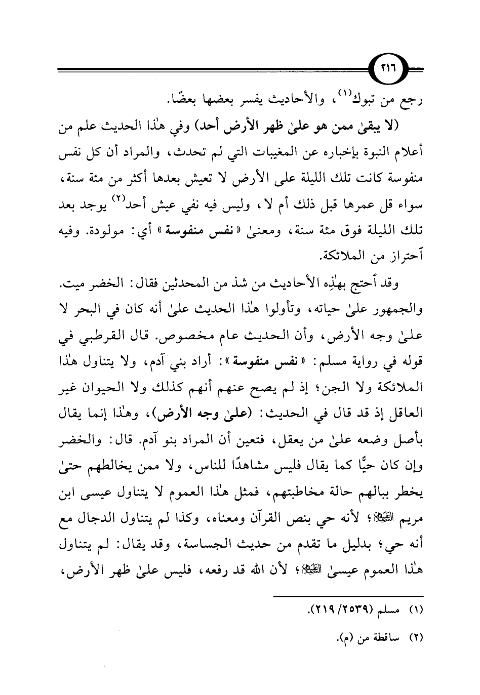 وقد احتج بهذِه الأحاديث من شذ من المحدثين فقال: الخضر ميت. والجمهور على حياته، وتأولوا هذا الحديث على أنه كان في البحر لا على وجه الأرض، وأن الحديث عام مخصوص. قال القرطبي في قوله في رواية مسلم: "نفس منفوسة": أراد بني آدم، ولا يتناول هذا الملائكة ولا الجن؛ إذ لم يصح عنهم أنهم كذلك ولا الحيوان غير العاقل إذ قد قال في الحديث: (على وجه الأرض)، وهذا إنما يقال بأصل وضعه على من يعقل، فتعين أن المراد بنو آدم. قال: والخضر وإن كان حيًّا كما يقال فليس مشاهدًا للناس، ولا ممن يخالطهم حتى يخطر ببالهم حالة مخاطبتهم، فمثل هذا العموم لا يتناول عيسى ابن مريم عليه السلام؛ لأنه حي بنص القرآن ومعناه، وكذا لم يتناول الدجال مع أنه حي؛ بدليل ما تقدم من حديث الجساسة، وقد يقال: لم يتناول هذا العموم عيسى عليه السلام؛ لأن اللَّه قد رفعه، فليس على ظهر الأرض،