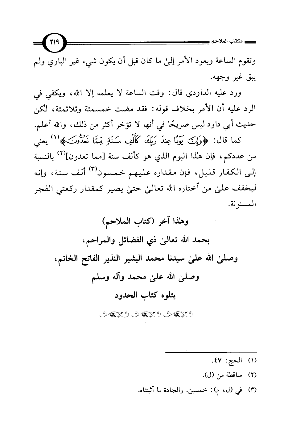 بحمد اللَّه تعالى ذي الفضائل والمراحم، وصلى اللَّه على سيدنا محمد البشير النذير الفاتح الخاتم، وصلى اللَّه على محمد وآله وسلم يتلوه كتاب الحدود