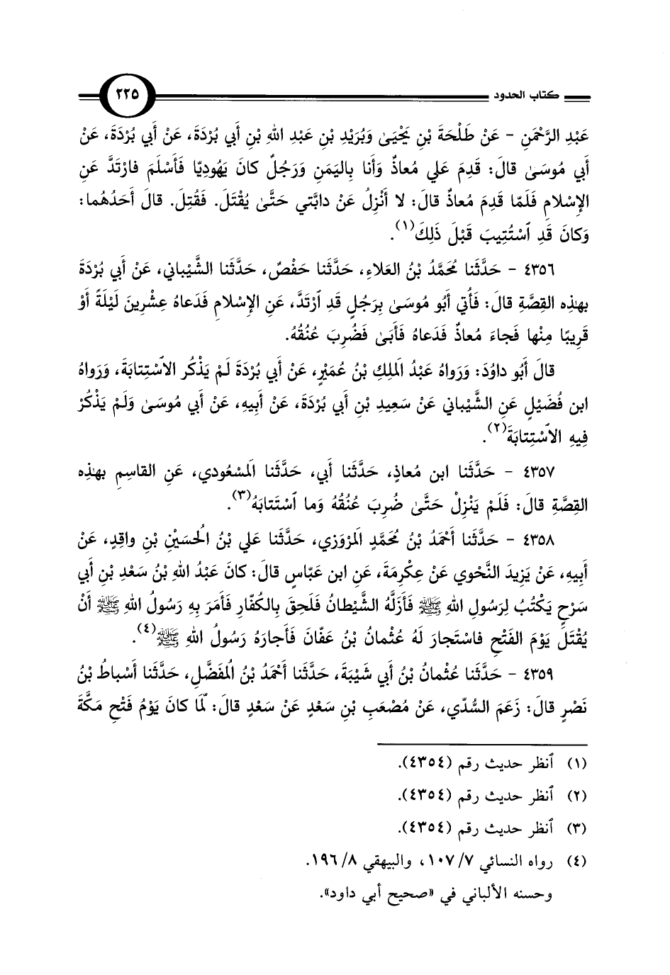 4356 - حَدَّثَنا مُحَمَّدُ بْن العَلاءِ، حَدَّثَنا حَفْصٌ، حَدَّثَنا الشَّيْباني، عَنْ أَبي بُرْدَةَ بهذِه القِصَّةِ قالَ: فَأُتي أَبُو مُوسَى بِرَجُلٍ قَدِ ارْتَدَّ، عَنِ الإِسْلامِ فَدَعاهُ عِشْرِينَ لَيْلَةً أَوْ قَرِيبًا مِنْها فَجاءَ مُعاذٌ فَدَعاة فَأَبَى فَضرِبَ عُنُقُهُ.