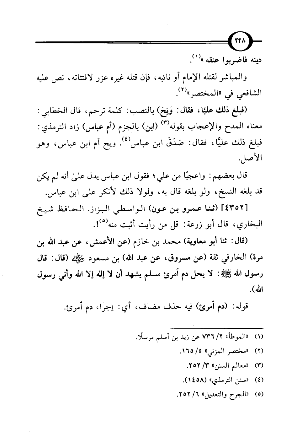 (قال: ثنا أبو معاوية) محمد بن خازم (عن الأعمش، عن عبد اللَّه بن مرة) الخارفي ثقة (عن مسروق، عن عبد اللَّه) بن مسعود -رضي اللَّه عنه- (قال: قال رسول اللَّه -صلى اللَّه عليه وسلم-: لا يحل دم امرئ مسلم يشهد أن لا إله إلا اللَّه وأني رسول اللَّه).